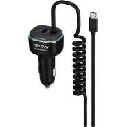 - Car charger with quick charge cable, direct charging, designed with iP/Type-C 2-in-1 Coiled Cable, and USB+USB-C Ports