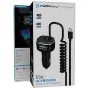 Powerology 120W Fast Car Charger / Triple Output USB-C PD 45W + USB-A QC 30W + Type-C Cable 45W / Stretchable Cable 0.3–1.2m / Zinc Alloy Body with LED Light / Compatible with iPhone / Samsung / iPad / MacBook – Black/Grey