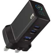 Powerology GaNex Multiple Ports Adapter with Foldable UK 3-Pin Plug, PD 67W, QC 18W, Laptop Charging, Smart Power Display, USB-A & USB-C Ports, Universal Compatibility – Black