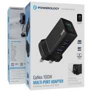 Powerology Universal GaN Adapter 85W Super Charger with 3x Type C port and 1x USB A port with Retractable type-C cable – Black