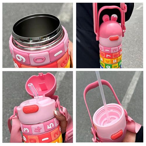 This 15 ounce kid’s insulated water bottle comes with rotatable numbers and math symbols to inspire hands on math skills and learning. The water bottle comes with a handle and adjustable shoulder strap, making it easy to use when on the go. Includes soft silicone straw and best of all keeps beverages at the desired temperature.