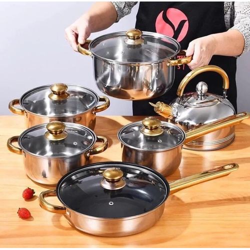 6 Pc Gold handles Stainless Steel Saucepans Cookware & Kettle – Silver