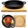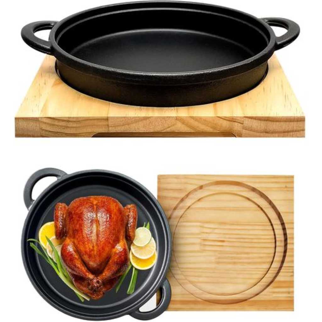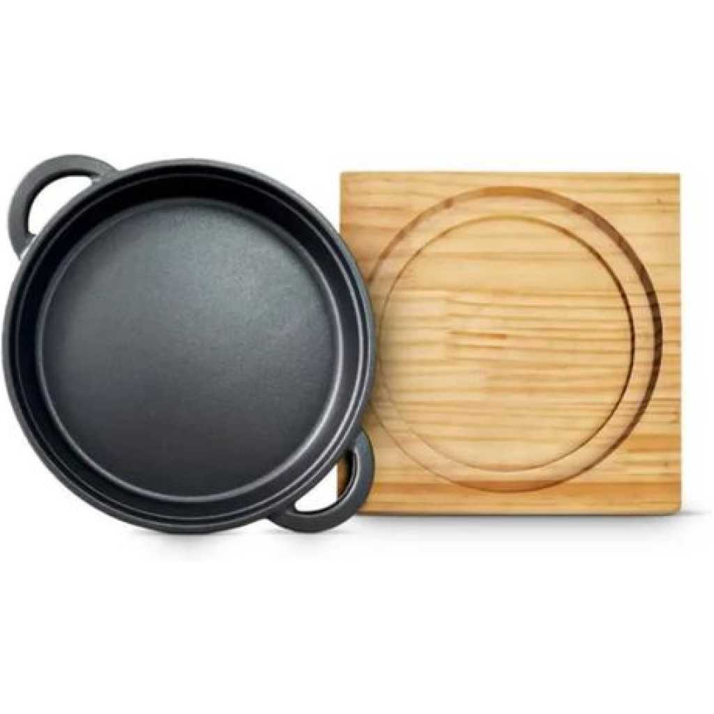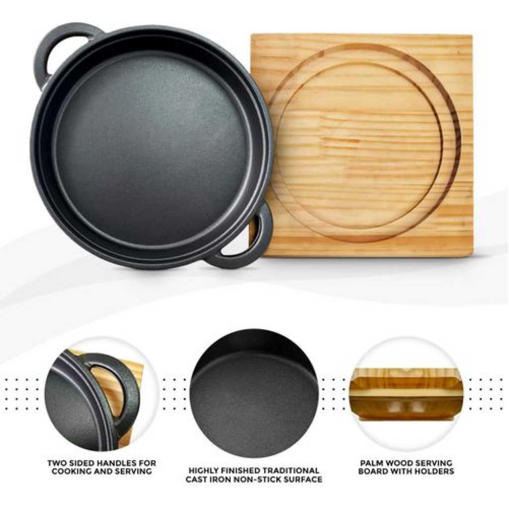 - ✔ Highly finished traditional pre-seasoned cast iron construction Stunning Frying, Grill and Backing Pot Pan Platter Plate with Palm Wood Serving Board Set helps you to cooking tasty and healthy meals in rapid and efficient way. It has features with two sided handles for cooking and serving