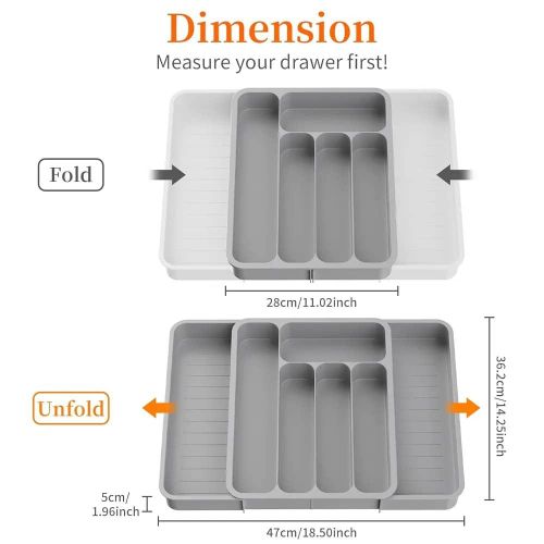 - 【Expandable & Adjustable】The kitchen utensil organizer has an adjustable width range of 11-19.7 in (28-50cm), fully expanded size is 19.7 x 14.3 x 2.1 in (50 x 36.4 x 5.3 cm), and the collapsed state size is 11 x 14.3 x 2.1 in (28 x 36.4 x 5.3 cm), suitable for most drawer sizes. Please measure your drawer before purchasing.