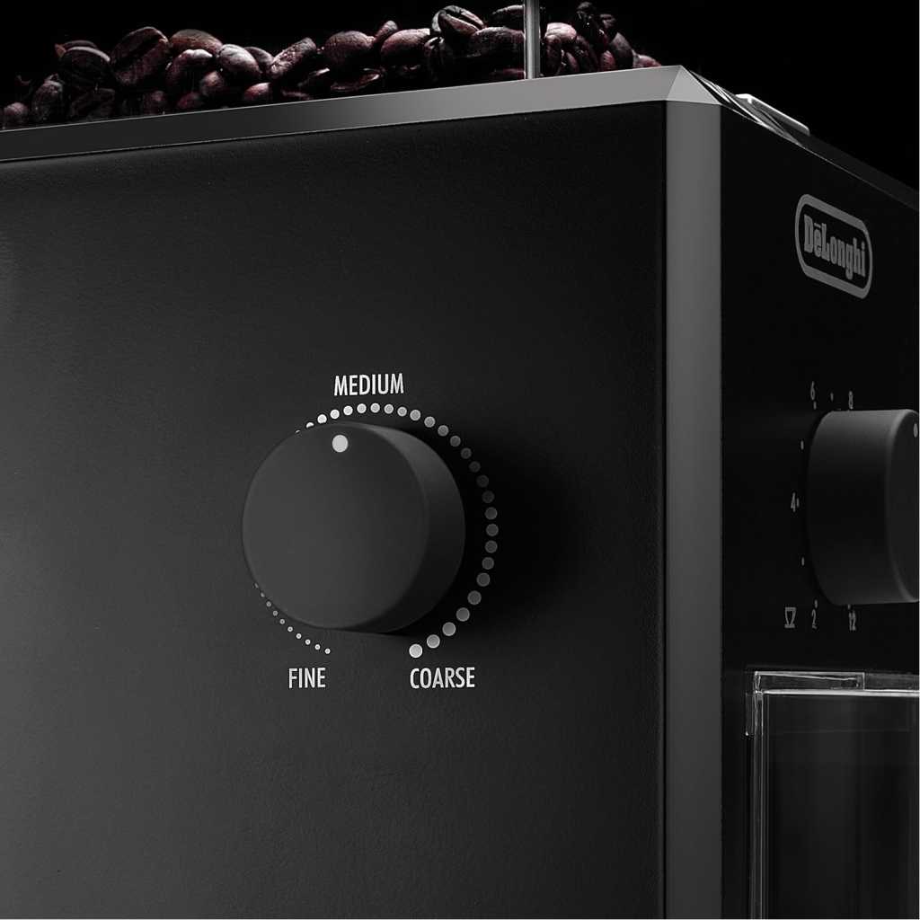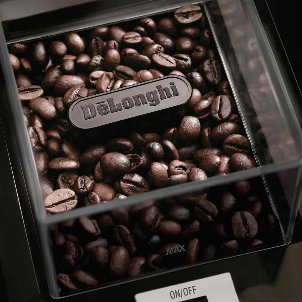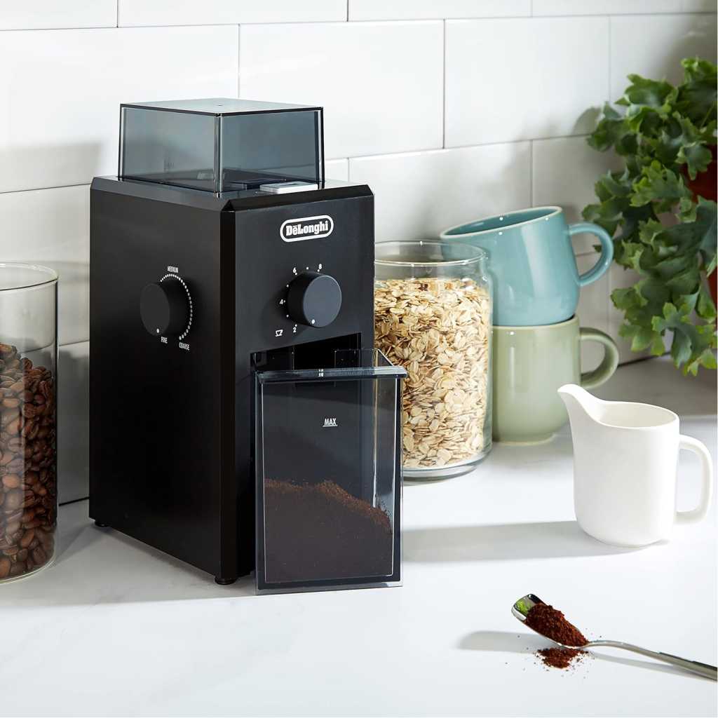 De’Longhi Electric Coffee Grinder KG79, 110W, Burr Grinding System, 12 Settings, Stainless Steel Blade, 12 Cup Capacity, 120g Bean Container, Removable Transparent Lid – Black