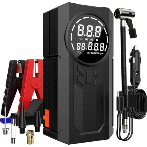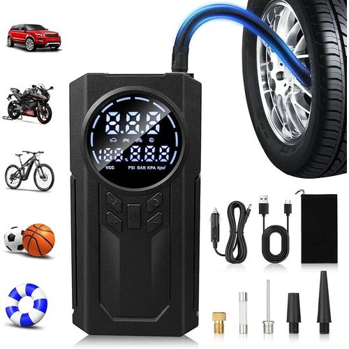 Electric Portable 4 in1 Car Jump Starter Mini Tire Inflator Air Compressor – DC 12V Dual Power Smart Air Pump Tires with Digital Pressure Gauge Display and Emergency Light for Car, Bike, Motorcycle, Balls, Swim Rings, Rechargeable via USB-C Bank Battery