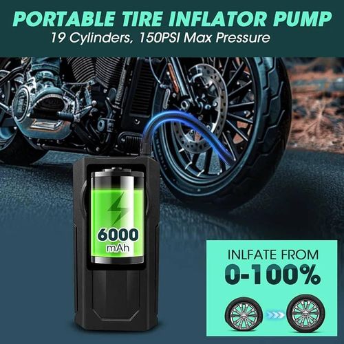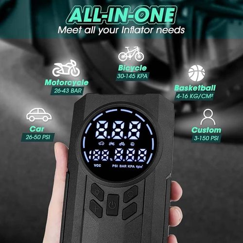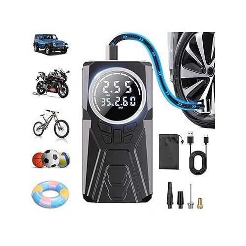 ????TIRE INFLATOR PORTABLE AIR COMPRESSOR – Equipped with a high-efficiency motor to allow for fast and efficient inflation, the 12V rechargeable battery air pump provides a maximum pressure of 150 PSI and airflow of 45L/Min, filling up the whole car tire within a few minutes. Perfect for inflating cars, motorcycles, bikes, balls, and other inflatables.