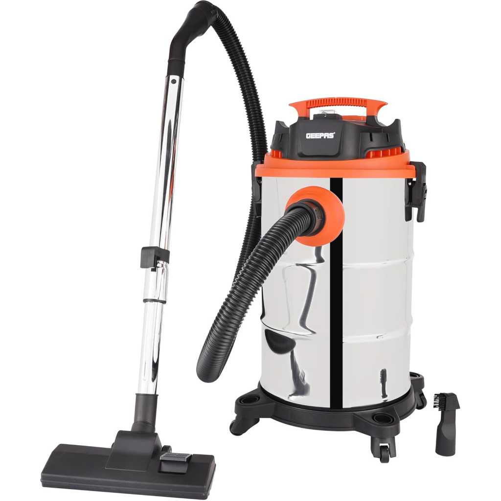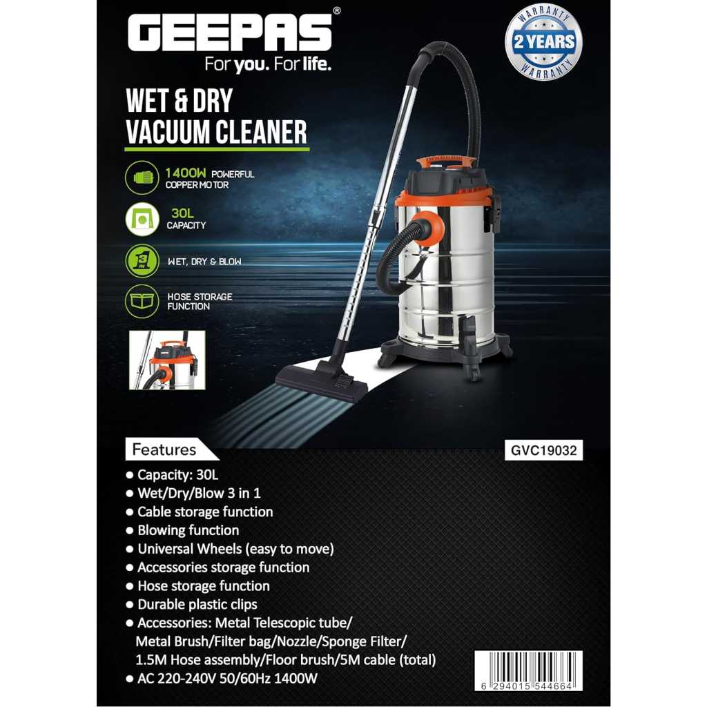Geepas 1400 W Wet and Dry Vacuum Cleaner- GVC19032 | 30L Dust Bag Capacity, 5 M Cord Length| 3-in-1 Function, Wet, Dry and Blow, Powerful Suction | Accessories Storage Function | 2 Years Warranty
