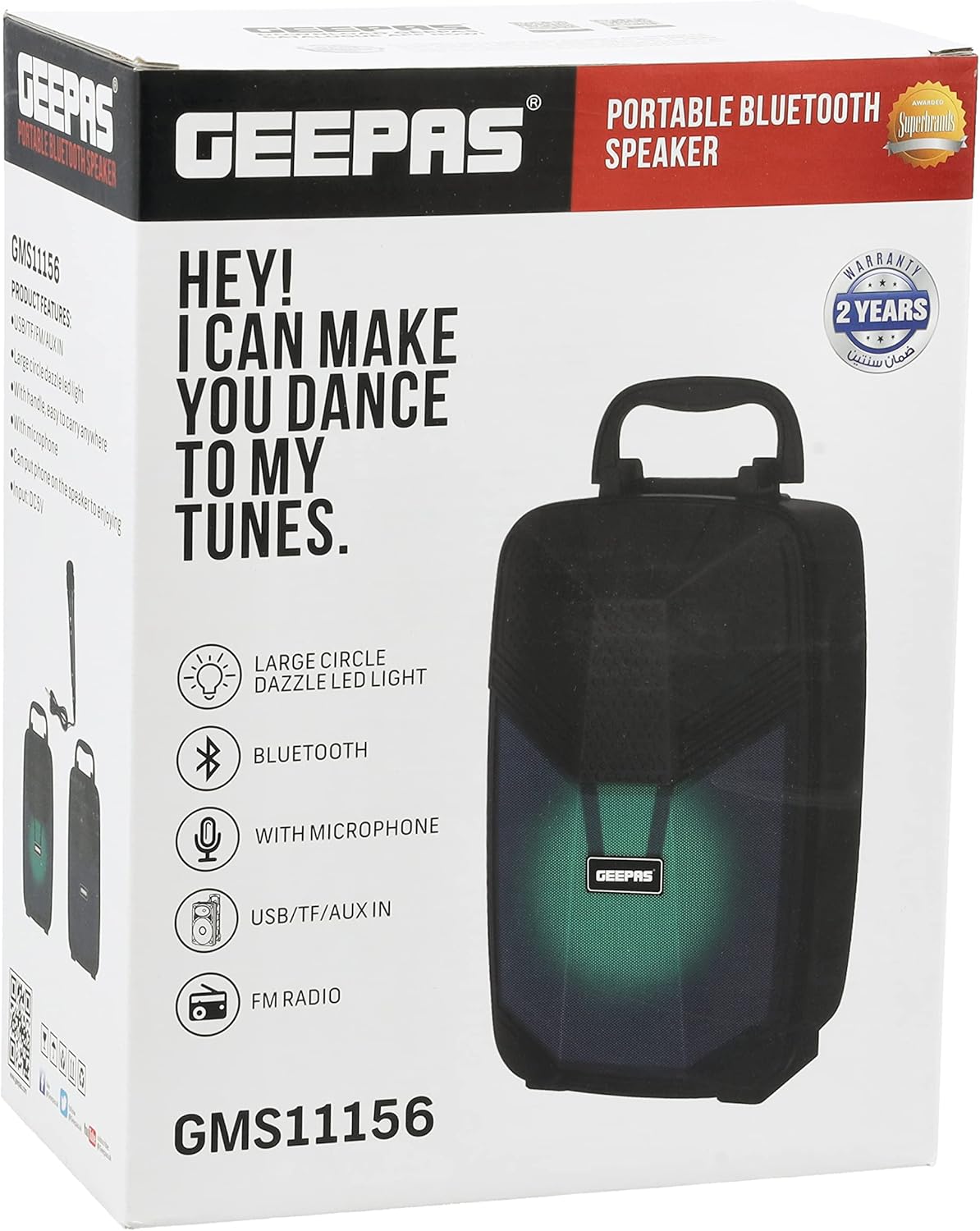 Geepas Portable Bluetooth Speaker, With Microphone, GMS11156 USB/TF/FM/AUX IN Large Circle Dazzle LED Light Portable & Lightweight Ideal For Home, Hotels & Outdoor Use, Black