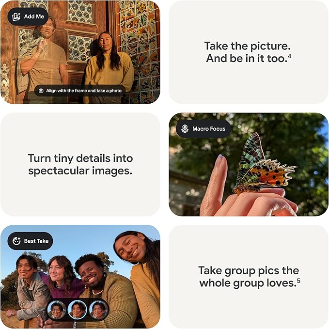 - Take amazing photos and videos with the Pixel Camera, and make them better than you can imagine with Google AI; get great group photos with Add Me and Best Take; and use Macro Focus for spectacular images of tiny details like raindrops and flowers