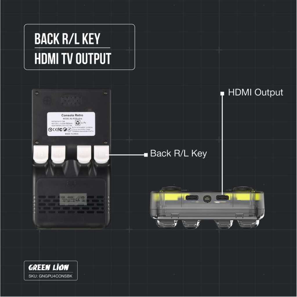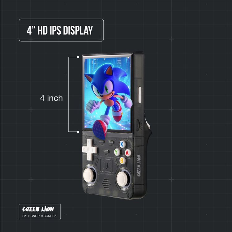 The Green Lion GP Ultra 4 Gaming Console is a powerful and portable handheld device, featuring 1GB RAM and 8GB eMMC storage, with an expandable 64GB TF card (up to 256GB). It boasts a 4-inch IPS HD screen (720 x 720), powered by a Mali-G31 MP2 GPU and a 1.5GHz Cortex-A35 CPU, delivering smooth gaming performance. The console runs on Linux and offers 5-7 hours of playtime with its 3000mAh battery, charging fully in just 1 hour via the Type-C port. With over 15,000 games available and 2.4GHz Wi-Fi connectivity, it’s a great choice for gaming on the go. Its durable ABS body ensures longevity and portability, making it an ideal companion for gamers.