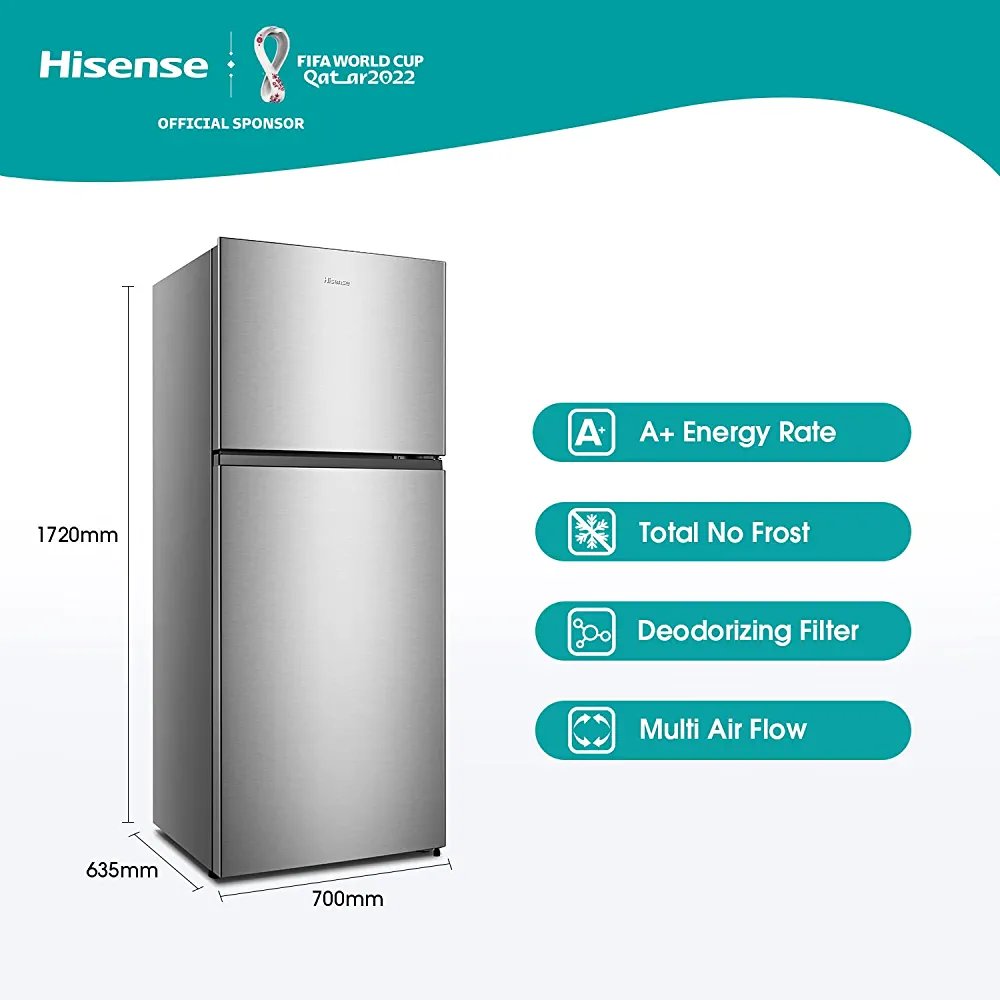 Hisense 488 – liters Refrigerator RT488N4ASU; Double Door Fridge, Frost Free Top Mount Freezer – Silver (3YRs WRTY)