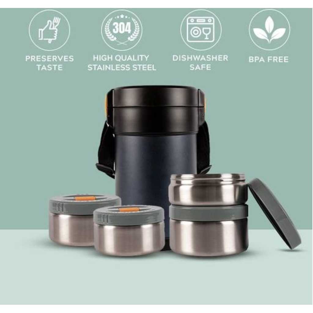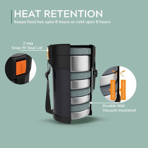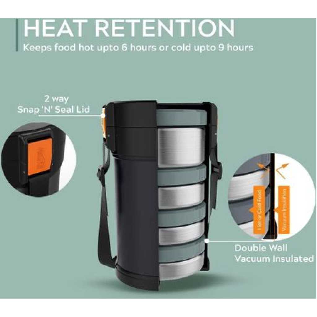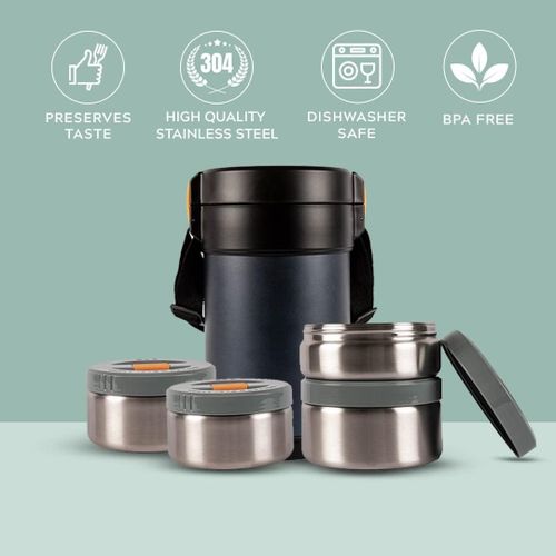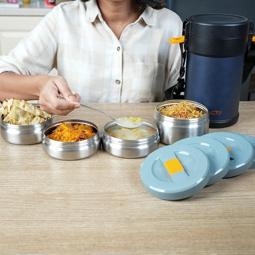 Specifications: 4 Container Capacity – (2 X 325) + 425 + 600 = 1675ml, Lunch Box Capacity – 2300ml, Lunch Box Dimensions – 24cm X 13.5cm X 5.3 inches, Packing Dimensions – 27cm X 6.5cm X 16cm, Weight – 0.5cm 5kg kg