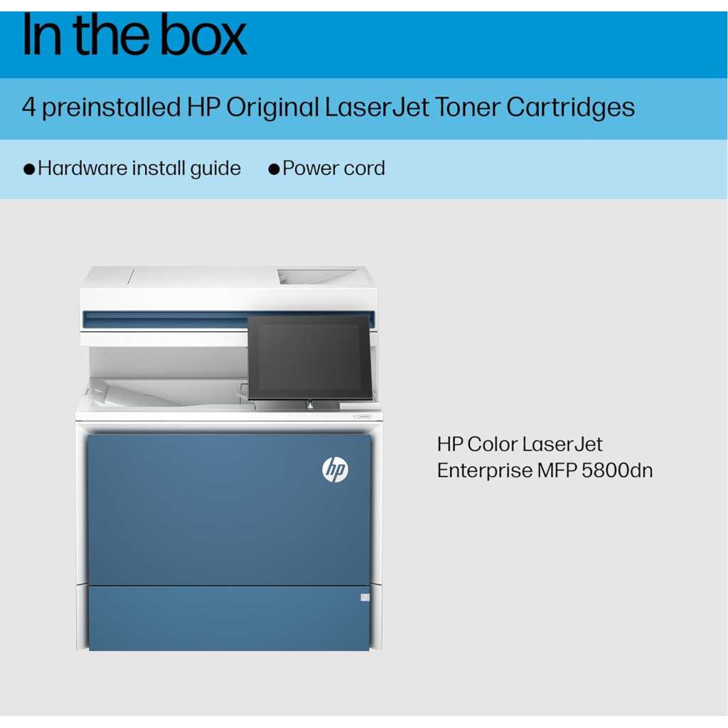 The HP Color LaserJet Enterprise MFP 5800dn is a high-performance multifunction printer designed to meet the demanding needs of large workgroups and enterprises. This robust and reliable device offers exceptional print quality, fast print speeds, and advanced features to streamline your workflow and enhance productivity. With its intuitive touchscreen interface, versatile connectivity options, and robust security features, the 5800dn is the perfect solution for businesses that demand the best.