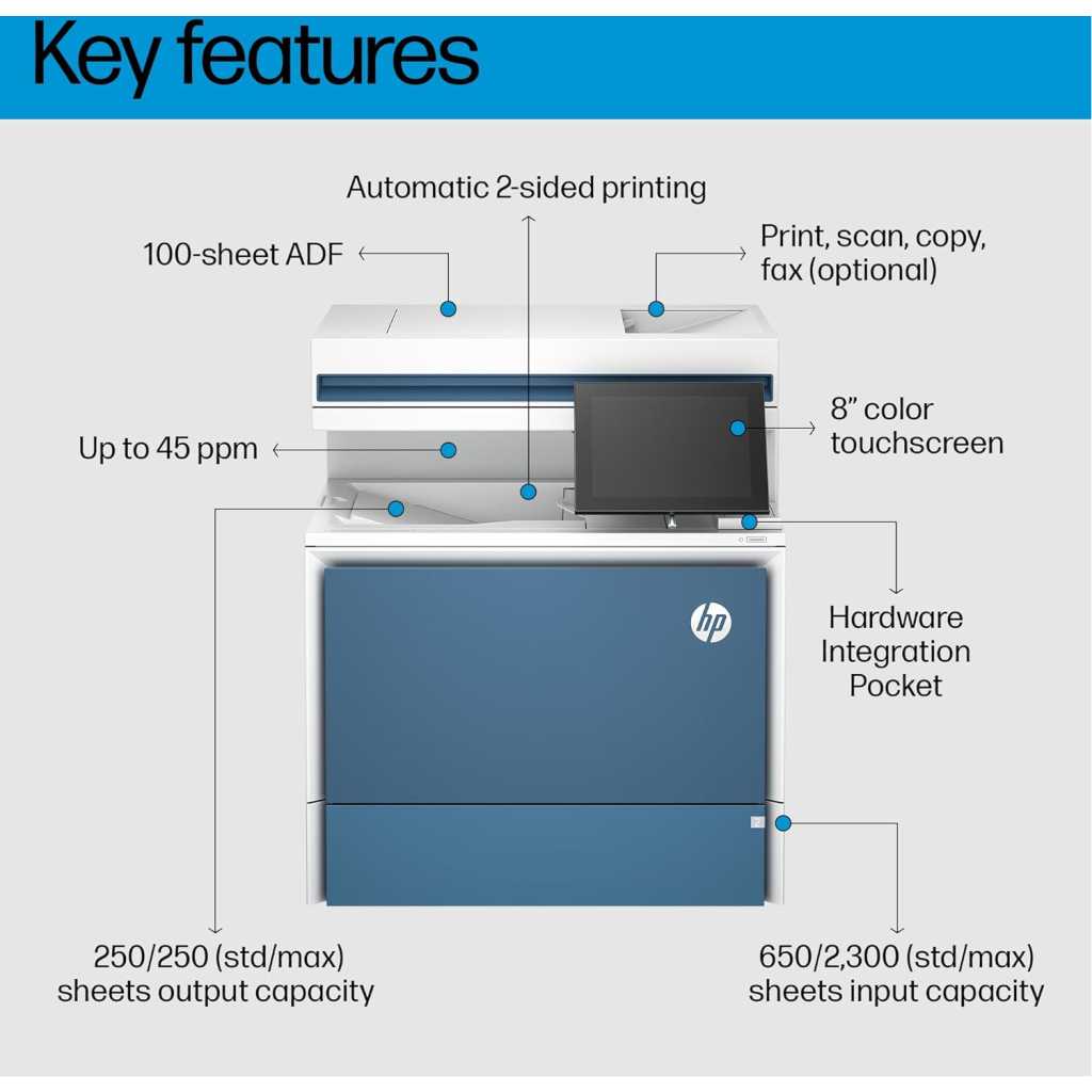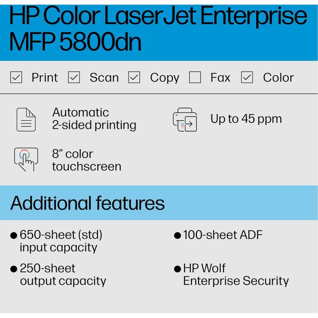 The HP Color LaserJet Enterprise MFP 5800dn is packed with advanced features to streamline your workflow and boost productivity. The 8-inch color touchscreen provides intuitive control over all printer functions, making it easy to navigate and configure settings. The printer also features a 100-sheet automatic document feeder (ADF) for scanning and copying multi-page documents quickly and efficiently.