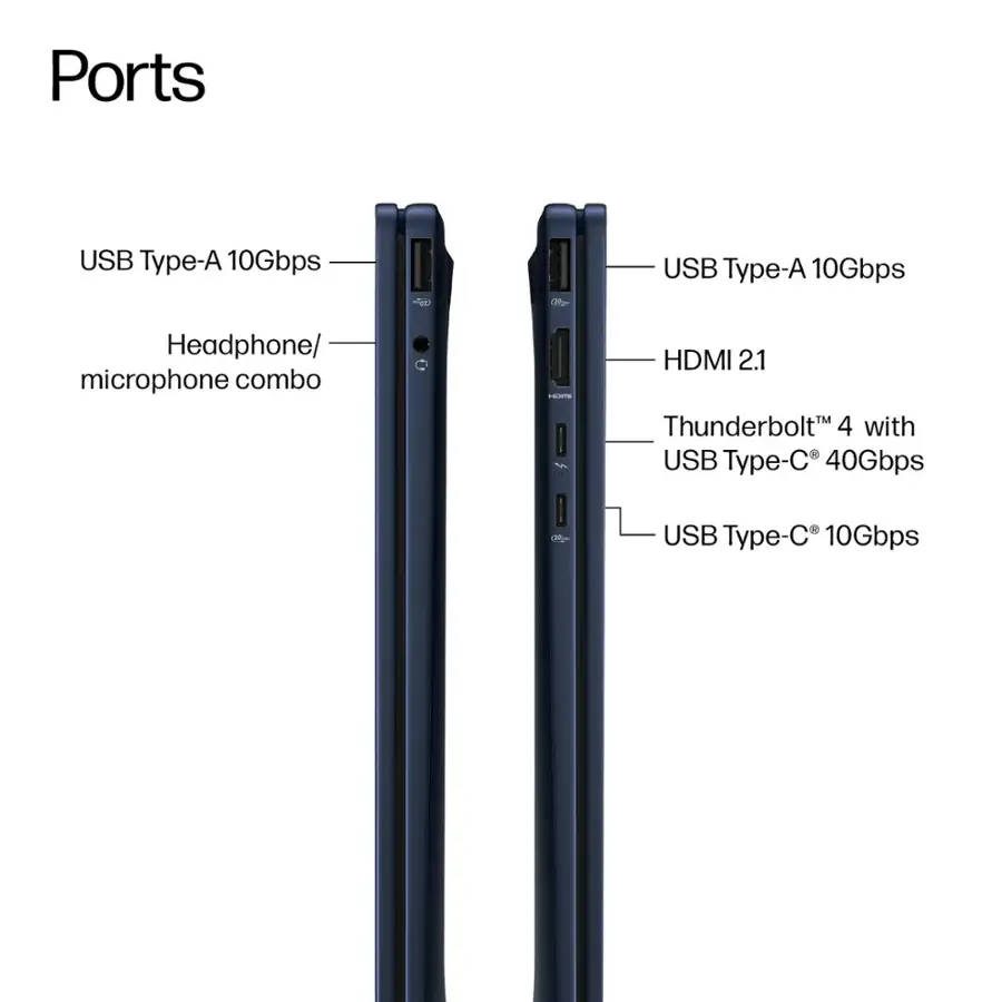 1 Thunderbolt 4 with USB Type-C (40Gbps signaling rate, USB Power Delivery, DisplayPort 2.1, HP Sleep and Charge), 1 USB Type-C (10Gbps signaling rate, USB Power Delivery, DisplayPort 1.4a, HP Sleep and Charge), 2 USB Type-A (10Gbps signaling rate), 1 headphone/microphone combo, 1 HDMI 2.1.