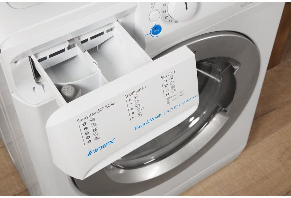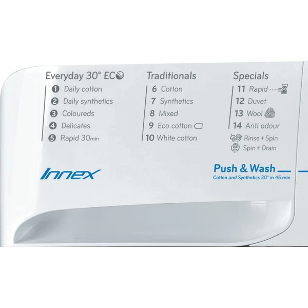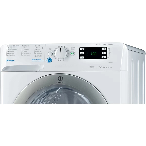 This Indesit freestanding front loading washing machine features: spacious and large 10 kg drum. Energy class A +++, for a reduction in consumption of up to 10%. High efficiency 1400 rpm centrifuge. White color. This Indesit freestanding front loading washing machine features: spacious and large 10 kg drum. Energy class A +++, for a reduction in consumption of up to 10%. High efficiency 1400 rpm centrifuge. White color. 2 seconds, 1 key, 0 problems. A single press of a button is enough to switch on, select and start a complete washing and drying program. Your savings every day. For your everyday laundry a 30 ° program that guarantees you the same results as a wash at higher temperatures. An important energy saving and the safety of always having fresh and clean clothes. Push & Wash technology – Turbo programming technology Just a quick click and your Innex immediately sets the washing program, even with the machine off, and starts it. In just 45 minutes, it removes the most frequent stains from everyday laundry, without the need to pre-treat the garments. Design Evolution – An all-Italian style. Reliable, robust with particular attention also to aesthetics, your Innex has a minimal style designed to make its use more comfortable. Push & Wash Push & Wash technology allows you to remove up to 20 types of stains without pretreating in just 45 minutes. Woolmark The Woolmark Apparel Care certified Wool program that protects your wool while ensuring unparalleled softness. Cotton 40 The Cotton 40 program takes care of your synthetics while removing stains at 40 ° in just 45 minutes. Cotton 60 The Cotton 40 program takes care of your common clothes, while removing stains at 40 ° in just 45 minutes. Water Balance Plus A specific program to reduce …