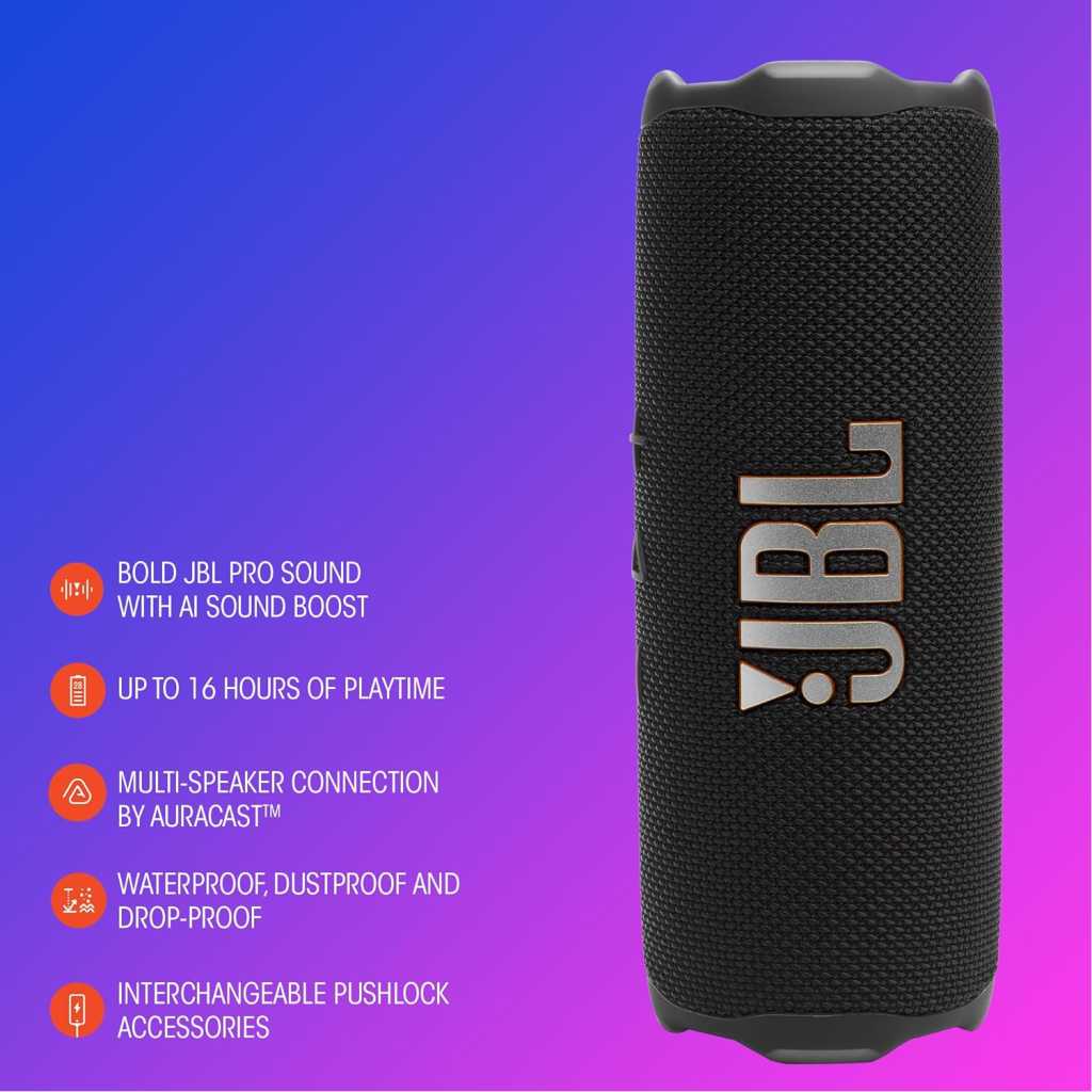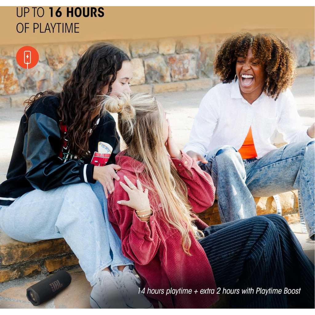 The JBL Flip 7 is our pint-sized audio boss. Enhanced with JBL AI Sound Boost, our signature sound is bigger than ever before, packing massive audio punch into a handheld package. And, did we mention it’s tough? The Flip 7 takes a beating without missing a beat, boasting industry-leading IP68 waterproof, dustproof and drop-proof. Plus, with new Playtime Boost we can enjoy up to 16 hours of playtime—because the moment should only ever stop on our terms.