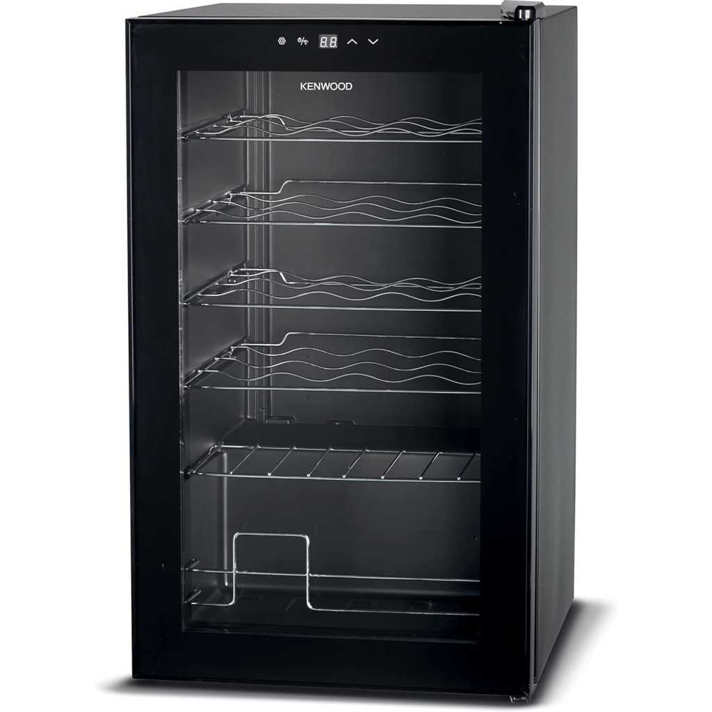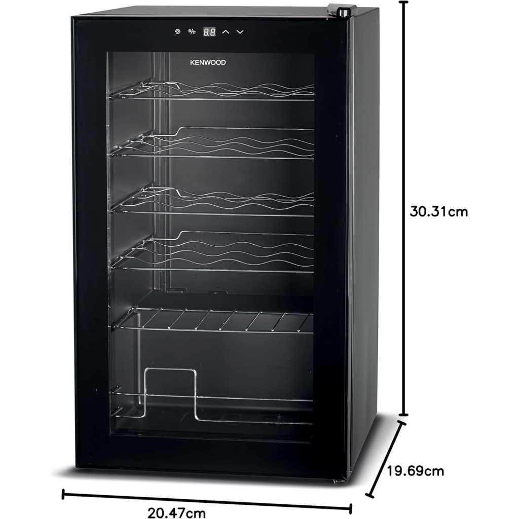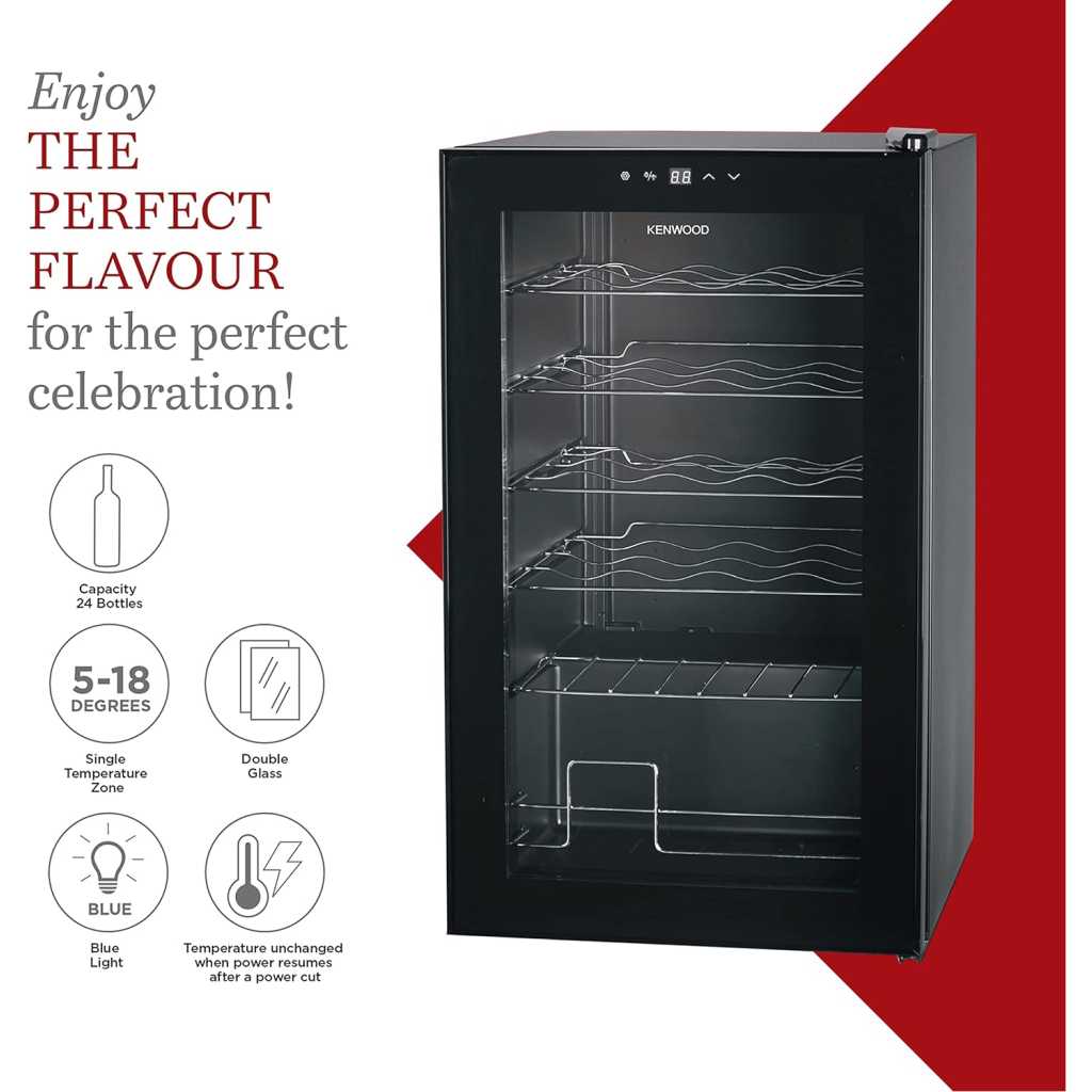 Kenwood Beverage Cooler 24 Bottles- Bases Capacity, Compact Cooling, Single Heat Zone 5 TPO 18 Degree, Metal Shelves, Interior Lighting, Door Glass, Dimensions 43 x 45 x74.24 Bottles Capacity Compressor Cooling Single Temperature Zone 5-18 degrees 50 Watts Metal Shelves Interior Light Glass Door Type: Wine Cooler Dimension 430*450*740mm