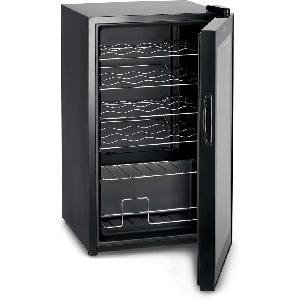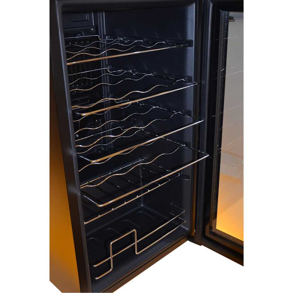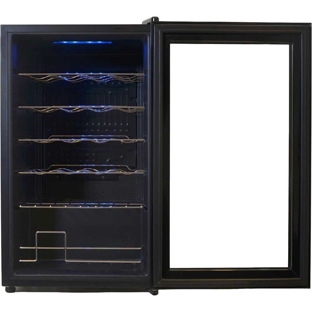 Kenwood Beverage Cooler 24 Bottles- Bases Capacity, Compact Cooling, Single Heat Zone 5 TPO 18 Degree, Metal Shelves, Interior Lighting, Door Glass, Dimensions 43 x 45 x74.24 Bottles Capacity Compressor Cooling Single Temperature Zone 5-18 degrees 50 Watts Metal Shelves Interior Light Glass Door Type: Wine Cooler Dimension 430*450*740mm
