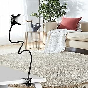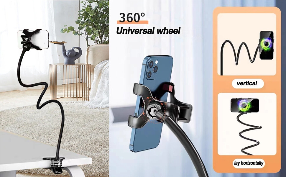 Strong gooseneck phone holder: with a sturdy silicone clip, can be installed onto any desk, headboard, bed, wall cabinet or chair.