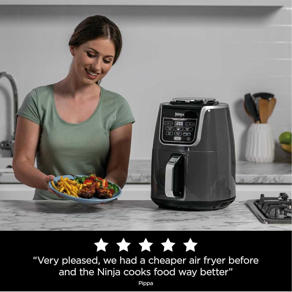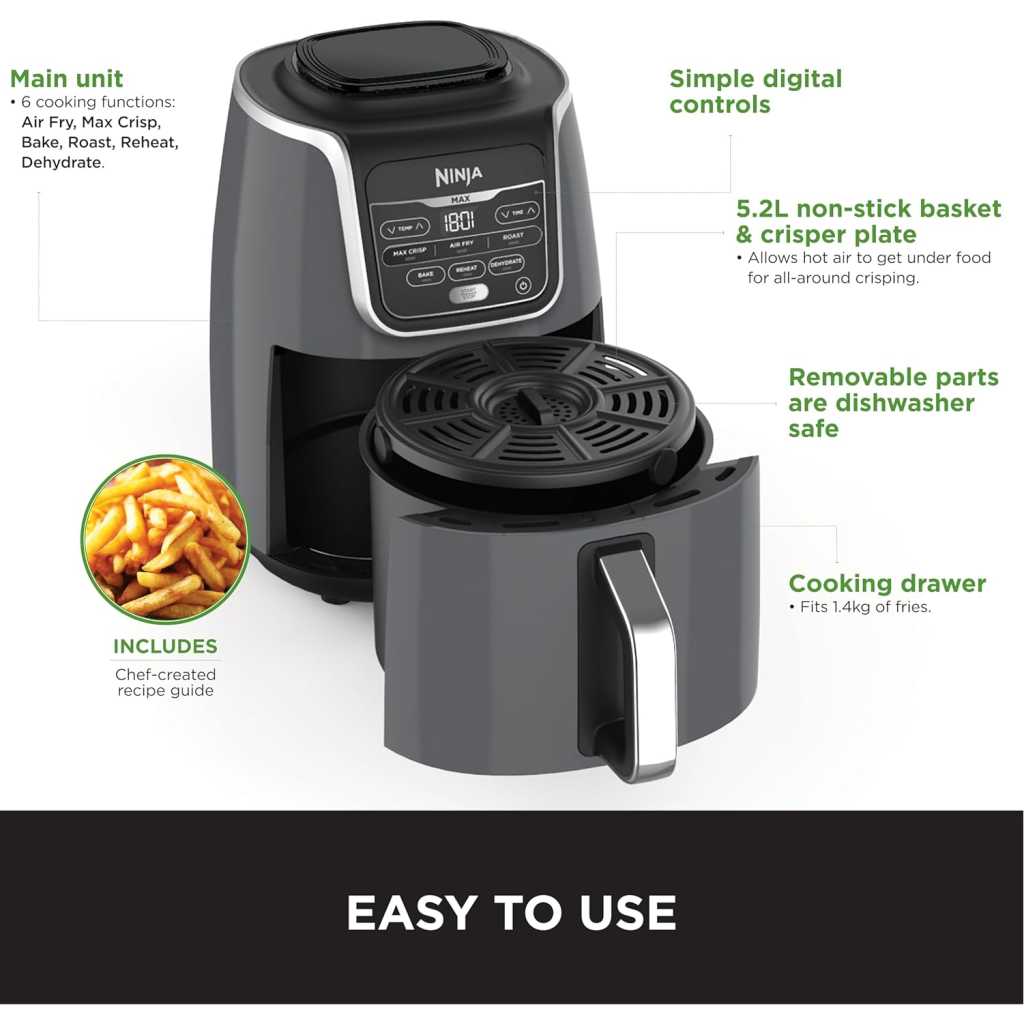 - INCLUDES: Ninja Air Fryer, Non-stick, dishwasher-safe 5.2L Basket & Crisper Plate. Chef-Created Recipe Guide. Weight: 5.2kg. Colour: Grey/Black.