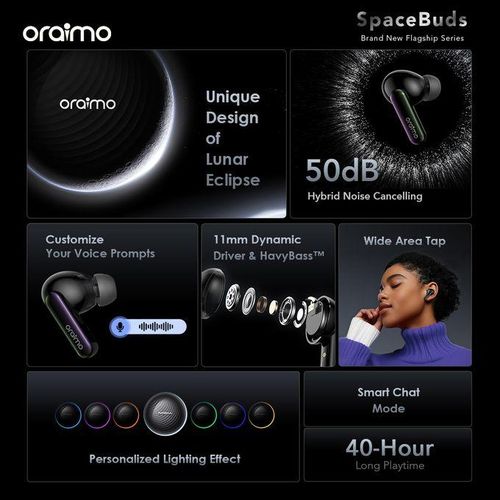 Experience pure tranquility like in the space with oraimo’s advanced hybrid noise-cancelling technology that drowns out distractions effortlessly and provides up to 50dB noise reduction. Immerse yourself in your favorite tunes, focusing solely on the sound that matters.