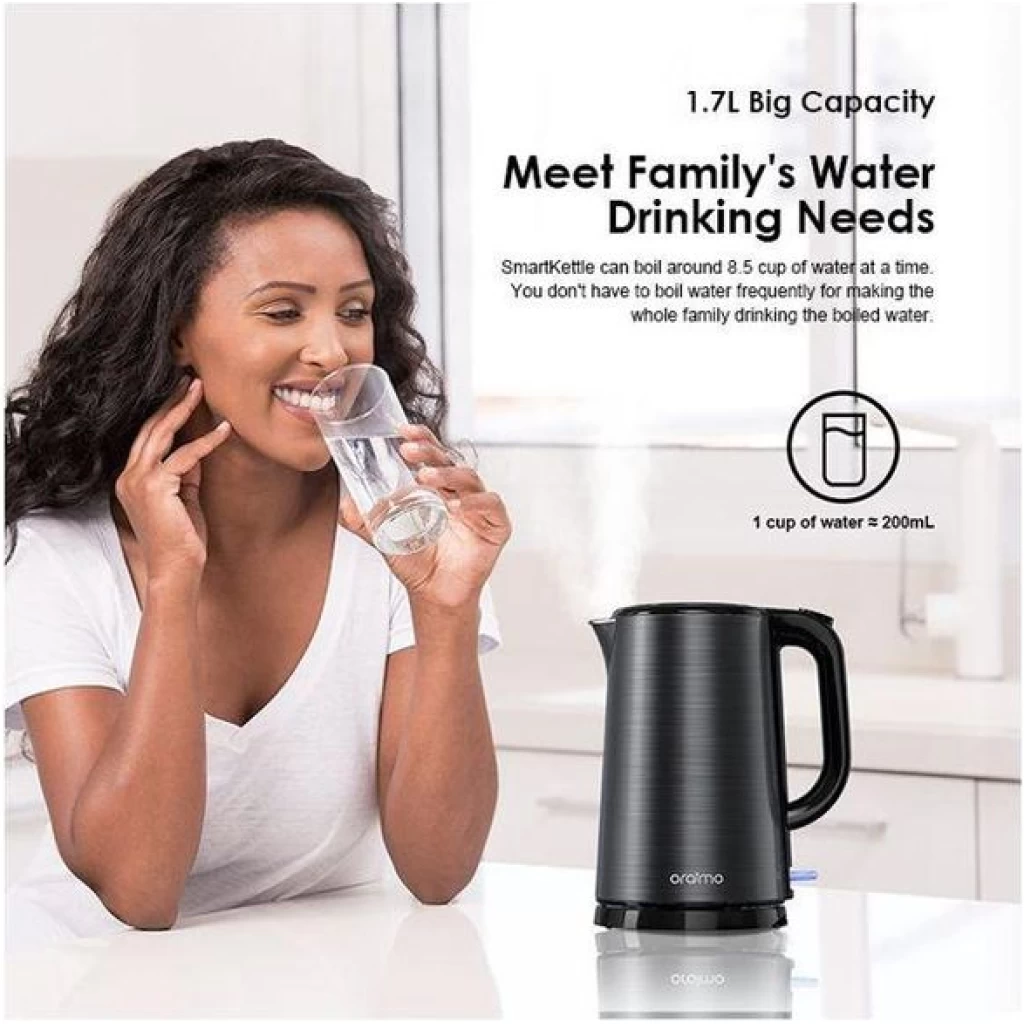SmartKettle can boil around 8.5 cup of water (1 cup of water ≒ 200mL) at a time. You don’t have to boil water frequently for making the whole family drinking the boiled water.