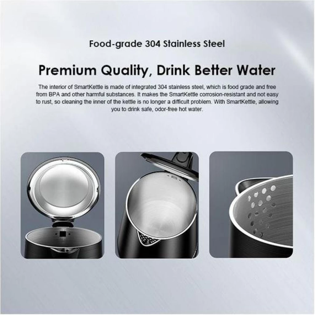 The interior of SmartKettle is made of integrated 304 stainless steel, which is food grade and free from BPA and other harmful substances. It makes the SmartKettle corrosion-resistant and not easy to rust, so cleaning the inner of the kettle is no longer a difficult problem. With SmartKettle, allowing you to drink safe, odor-free hot water.