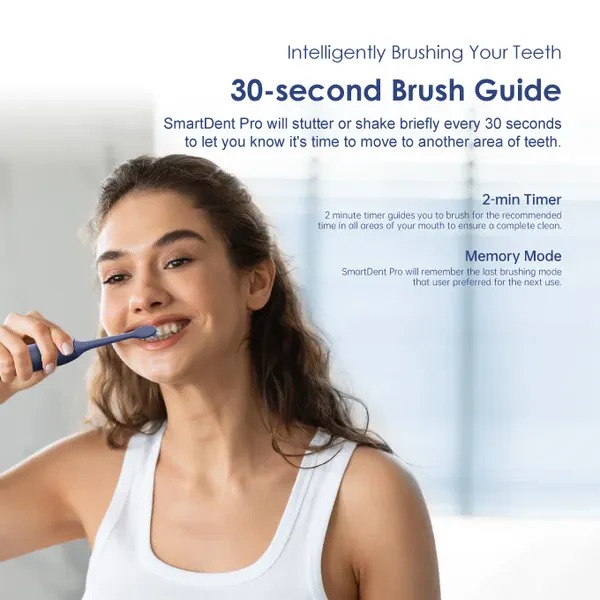 30-second Brush Guide: SmartDent Pro will stutter or shake briefly every 30 seconds to let you know it’s time to move to another area of teeth.