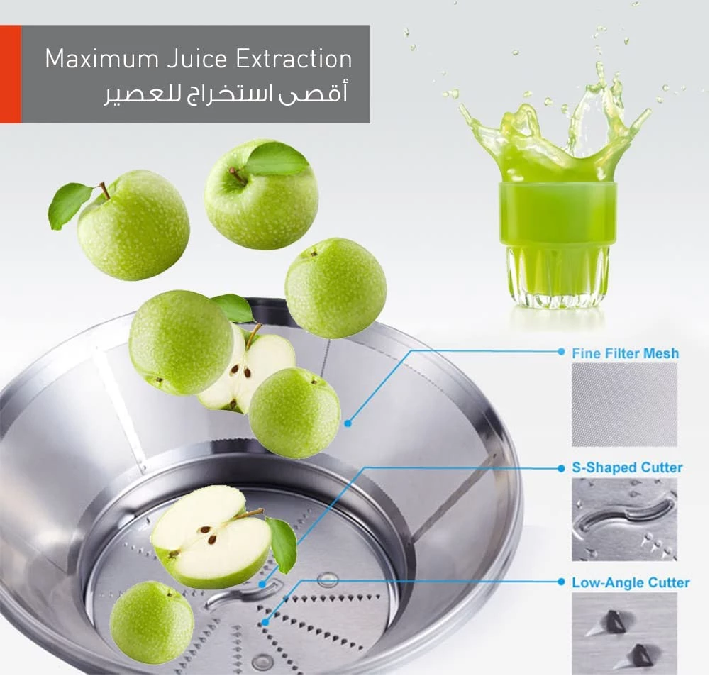 Maximum Juice ExtractionThe Full Metal Spinner’s S-Shaped Cutter firmly holds fruit in place as it is being juiced, and centrifugal force works to eject the pulp. It squeezes more efficiently because the fruit doesn’t spin. Thorough extraction is achieved by the Low-Angle Cutter, and the fine Filter Mesh separates the juice from the pulp so you always get a refreshing, thirst-quenching drink. |