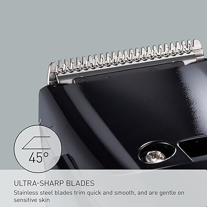 This sleek, powerful wet dry trimmer does everything from simple hair touch-ups to detailed beard styling. Precision-honed 45° blades and trimmer dial provide 19 hair length settings.