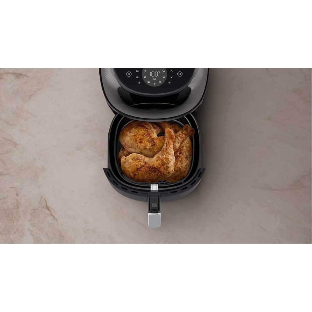 Up to 40% of excess fat drips away for healthier meals with full flavor*. The basket keeps food separate from the fat collected in the pan as it cooks. * Chicken leg: up to 40% less fat vs raw