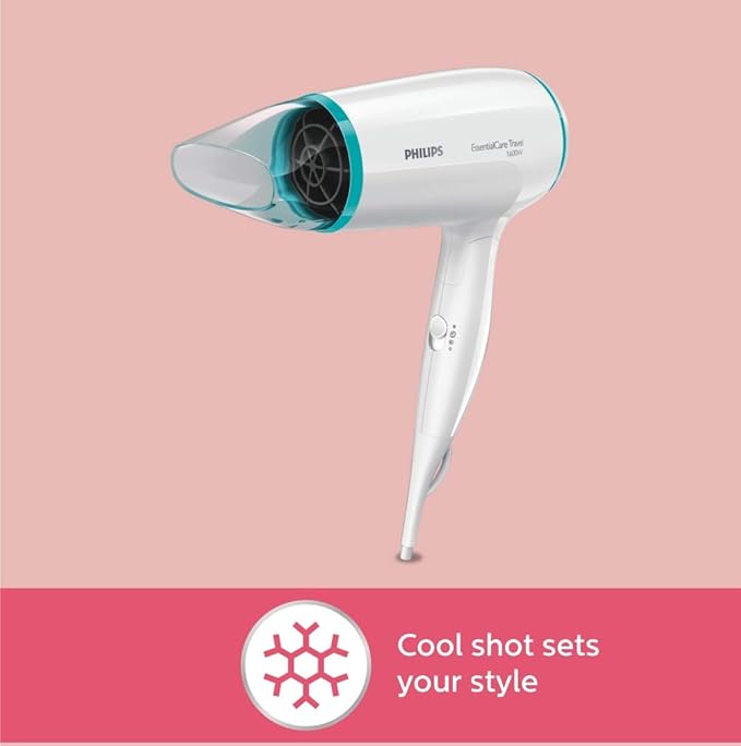 Philips EssentialCare Travel Hair Dryer BHD006, 1600 Watts For Gentle Drying, Cool Shot For Hair Styling, Thermo Protect, Quieter Drying, Easy Storage Handle