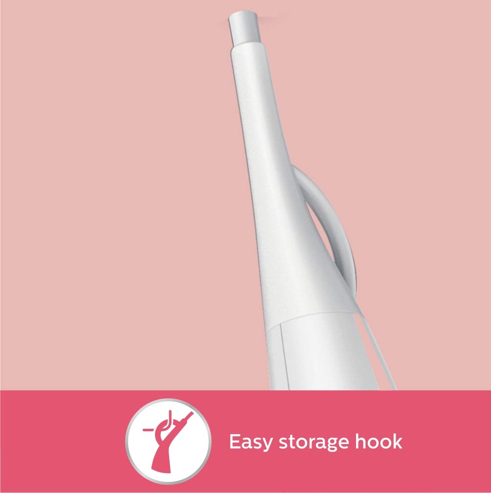 A rubberized hook can be found on the base of the handle. Use to store easily at home or if staying at a hotel.