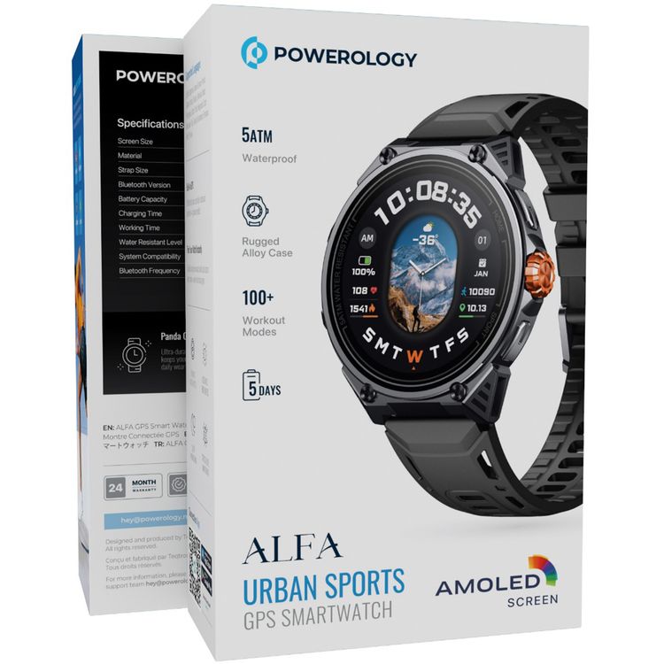 The Powerology Alfa Urban Sports Smart Watch is designed for both style and functionality. Featuring a vibrant 1.43” AMOLED display, the watch provides crystal-clear visuals that make checking notifications or tracking your fitness a pleasure. Built with a durable zinc alloy frame, it’s built to withstand the rigors of daily use. With Bluetooth V5.4, the watch offers seamless connectivity to your smartphone, allowing you to stay connected with smart calling features and real-time notifications. The watch is also water-resistant with 5ATM rating, making it suitable for swimming and other water-based activities. Equipped with a 480mAh battery, it lasts up to 5 days on a single charge, ensuring reliability throughout the week. It offers over 100 workout modes, dynamic watch faces, and features such as sleep and stress level monitoring. Raise to wake technology activates the screen with a simple lift of the wrist, while Panda Glass protects the display from daily wear and tear. Compatible with both Android 8.0+ and iOS 12+ devices.