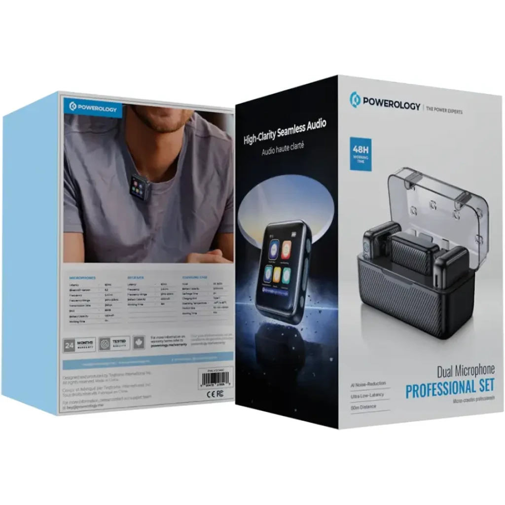 The Powerology Dual Microphone Professional Set offers high-quality, seamless audio with advanced features to elevate your sound experience. It is designed with AI-powered noise reduction technology, providing clear and crisp audio even in noisy environments. The system operates with ultra-low latency of 60ms, making it ideal for live performance and streaming. The included LCD info display on the microphones provides essential real-time information for ease of use.