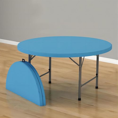 IDEALT 48-Inch Round Light Commercial Fold-In-Half Tables are constructed of high-density polyethylene which is normally used in water bottles or nursing bottles. At the same time, adopting a 1-step blow molding with blue dots color molding technology makes the tabletop stronger and crack-free. 1.75” thickness waterproof tabletop coordinates with gray powder-coated triangular locking frame in rust-resistance steel lead to an optimized solution for indoor and outdoor use. It is ideal for parties, events, and family reunions.