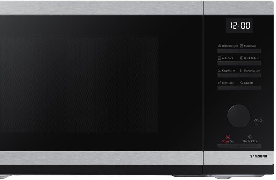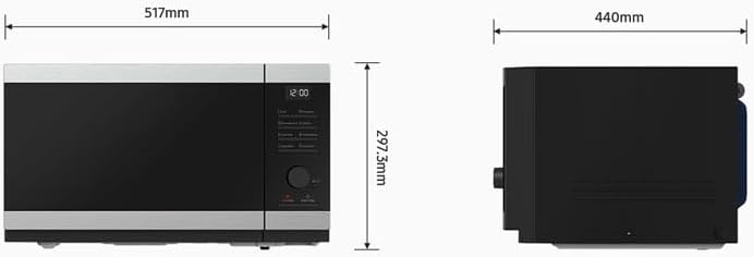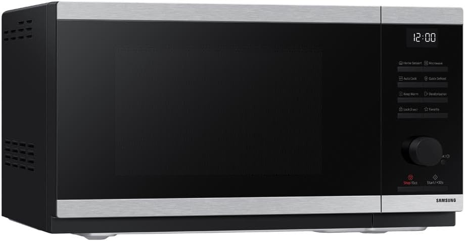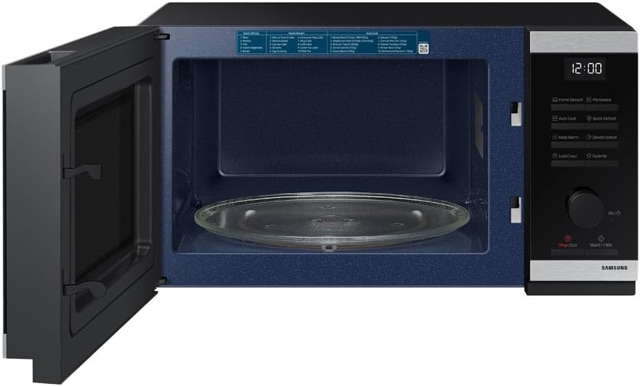 - What’s in the box: Samsung Solo Microwave, 800W, Capacity: 23 Litre, Dimensions: 37.7 x 27.5 x 48.9 cm, Weight: 12.2 kg, Stainless Steel, MS23DG4504ATE3