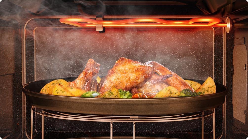 - Steam Cook – Enjoy healthy steam cooked food with the Pure Steamer,¹ Simply put water in the heat-resistant² pure steamer and place the ingredients on the rack, Then enter the food type and size and it optimises the cooking time