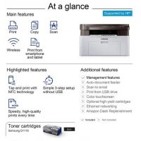 - GREAT VALUE FOR YOUR HOME OFFICE – This Samsung all-in-one laser printer features superior print quality, NFC + WiFi connectivity, monochrome laser printing, copy, scan, fax, fast print speed, USB port, auto document feeder, and built-in Ethernet.