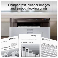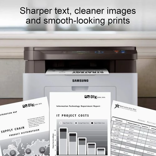 Always get reliable quality for crisp black text with Samsung’s innovative imaging technology while saving up to 20% on toner with Samsung’s Easy Eco Driver. Professional Image Quality: Samsung’s ReCP technology improves readability of printed and scanned documents by enhancing thin lines and sharpening edges. You get sharp, solid prints with an effective resolution of up to 1200 x 1200 dpi. Fast Print Speeds: Streamline your workflow and print up to 21 pages per minute, so you can spend more time producing and less time waiting. Compact, Ergonomic Design: The printer’s small footprint saves space for your home office. And the two-tone design is well suited for today’s modern office settings.