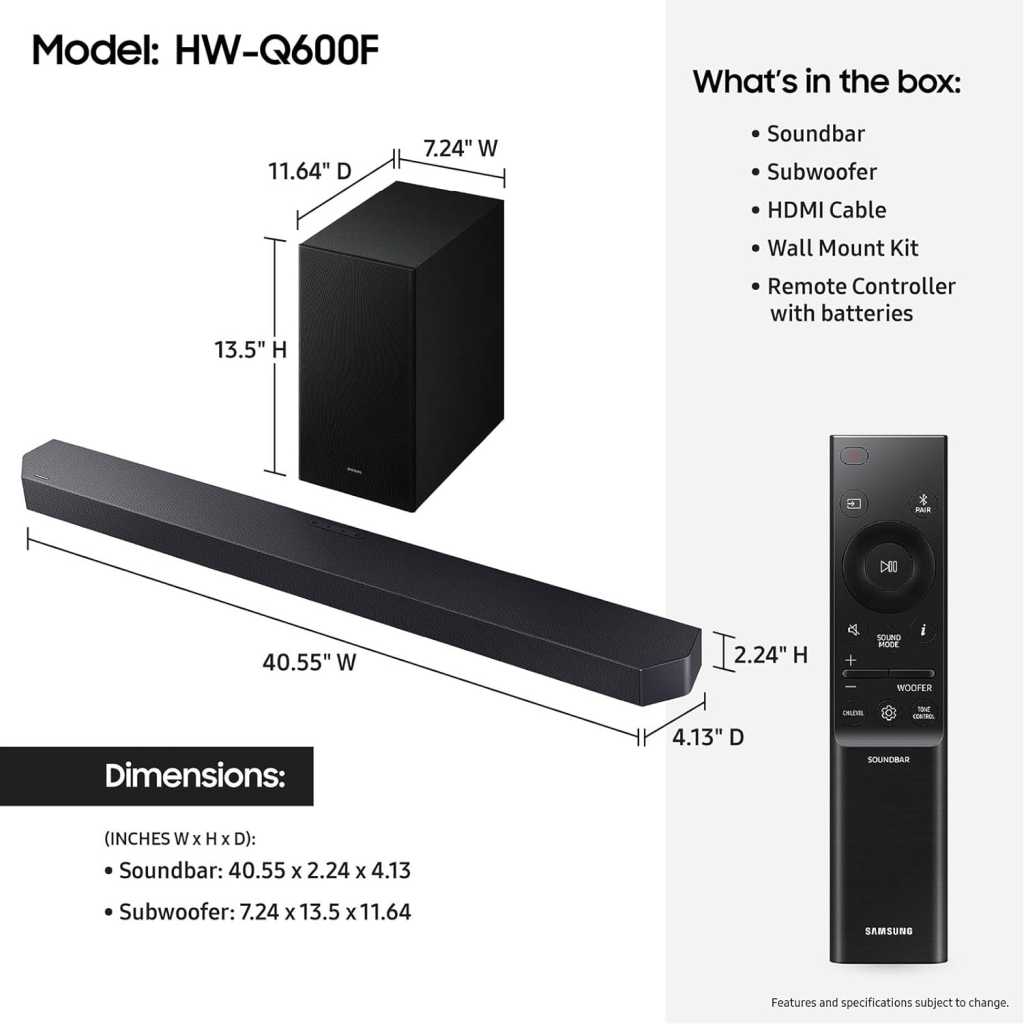 Soundbar, Subwoofer, Remote Controller, HDMI Cable, Wallmount Kit, Battery for Remote Controller