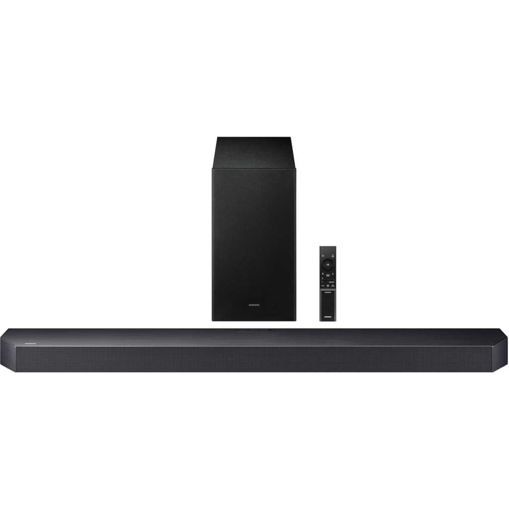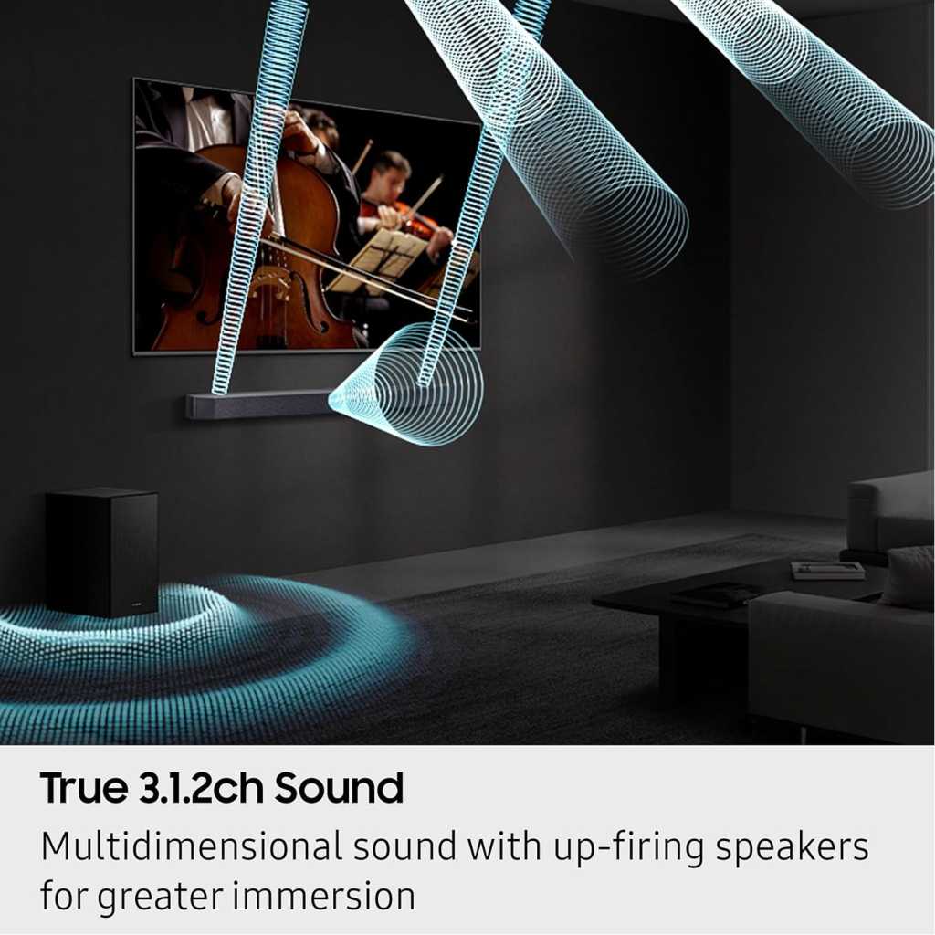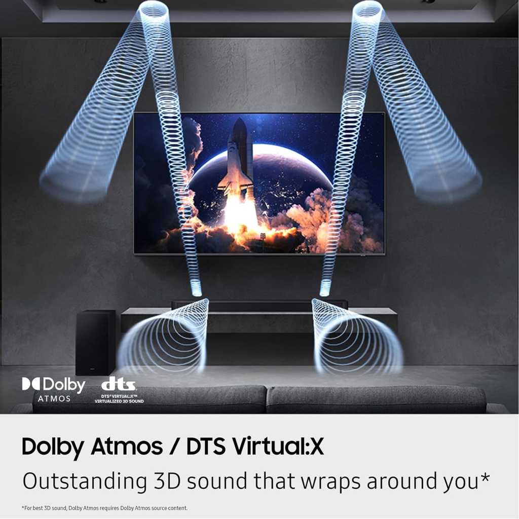 Get swept away into any film, concert or soundtrack with Dolby Atmos 3D sound that reveals rich depth and intricate details. Be surrounded by sound and feel at the center of it all with up-firing channels that project audio overhead, a dedicated center channel for clear dialogue and a wireless subwoofer that delivers room-shaking bass. Pair the soundbar with a Samsung TV to experience powerful, robust audio with Q-Symphony and level up your entertainment a notch or two or three.