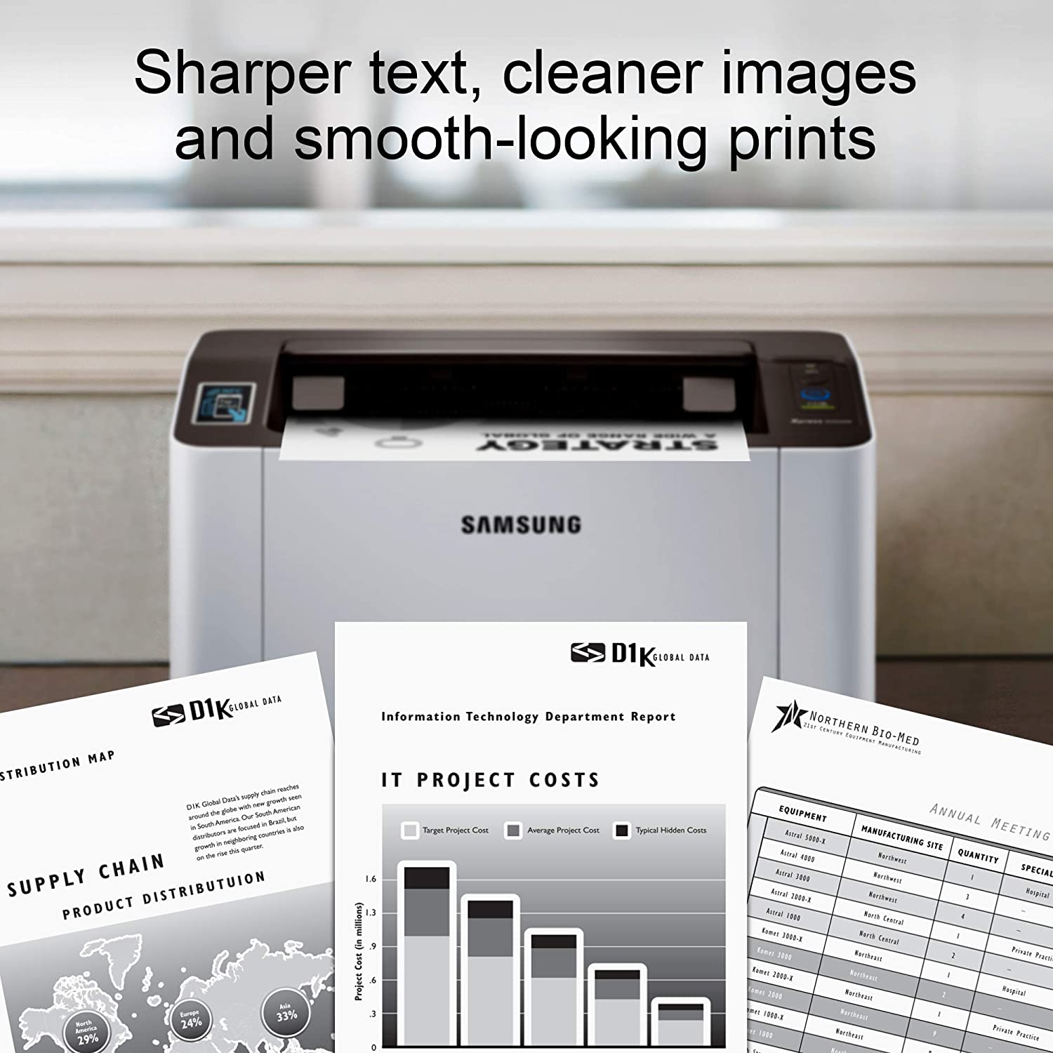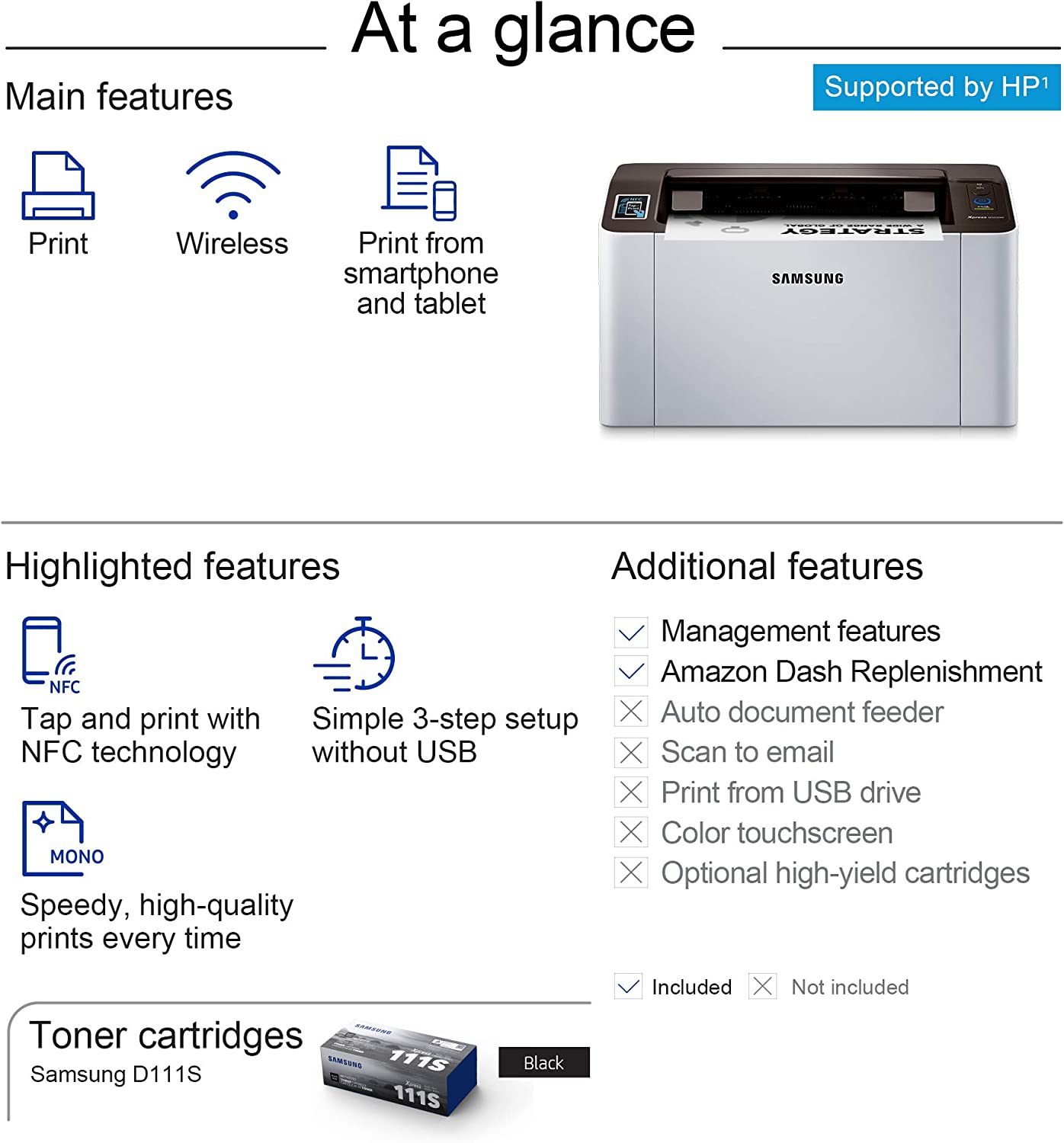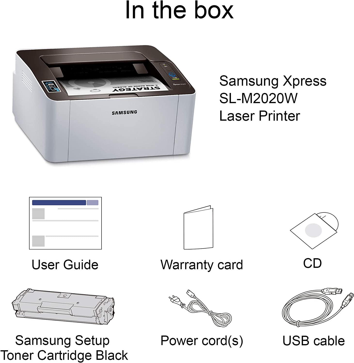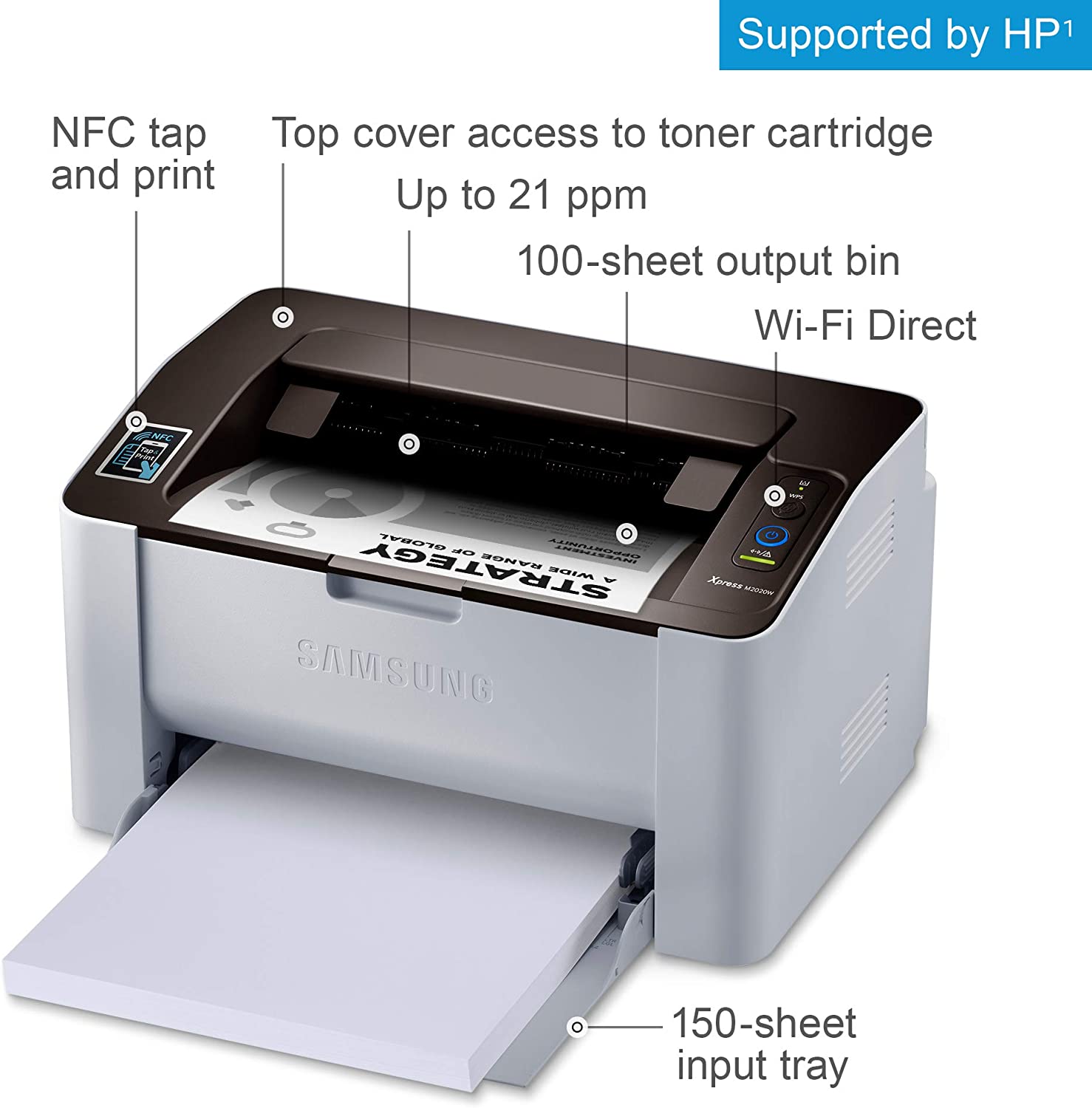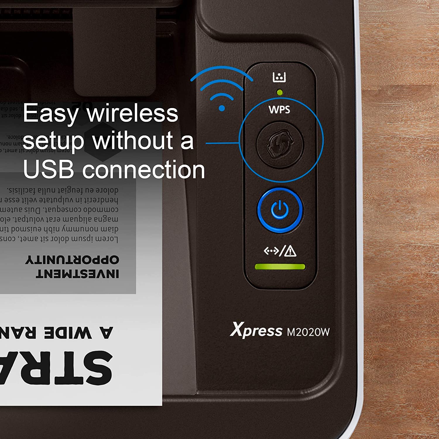 The Samsung Xpress M2020W printer is perfect for your home office and combines ease of operation with high performance at an affordable price. Samsung Xpress M2020W Laser Printer delivers hassle-free mobile printing and all-around efficiency that are perfect for your cost-conscious SOHO work environment or home office. Quick and easy wireless printer installation gets you up and running fast. Always get reliable quality for crisp black text with Samsung’s innovative imaging technology while saving up to 20% on toner with Samsung’s Easy Eco Driver. Professional Image Quality: Samsung’s ReCP technology improves readability of printed and scanned documents by enhancing thin lines and sharpening edges. You get sharp, solid prints with an effective resolution of up to 1200 x 1200 dpi. Fast Print Speeds: Streamline your workflow and print up to 21 pages per minute, so you can spend more time producing and less time waiting. Compact, Ergonomic Design: The printer’s small footprint saves space for your home office. And the two-tone design is well suited for today’s modern office settings. 1. As of Nov. 1, 2017, HP acquired Samsung’s printing business and Samsung printers were added to the HP portfolio of products. Samsung printers enjoy HP’s warranty support in accordance with warranty documents accompanying the products.