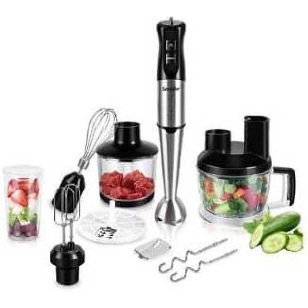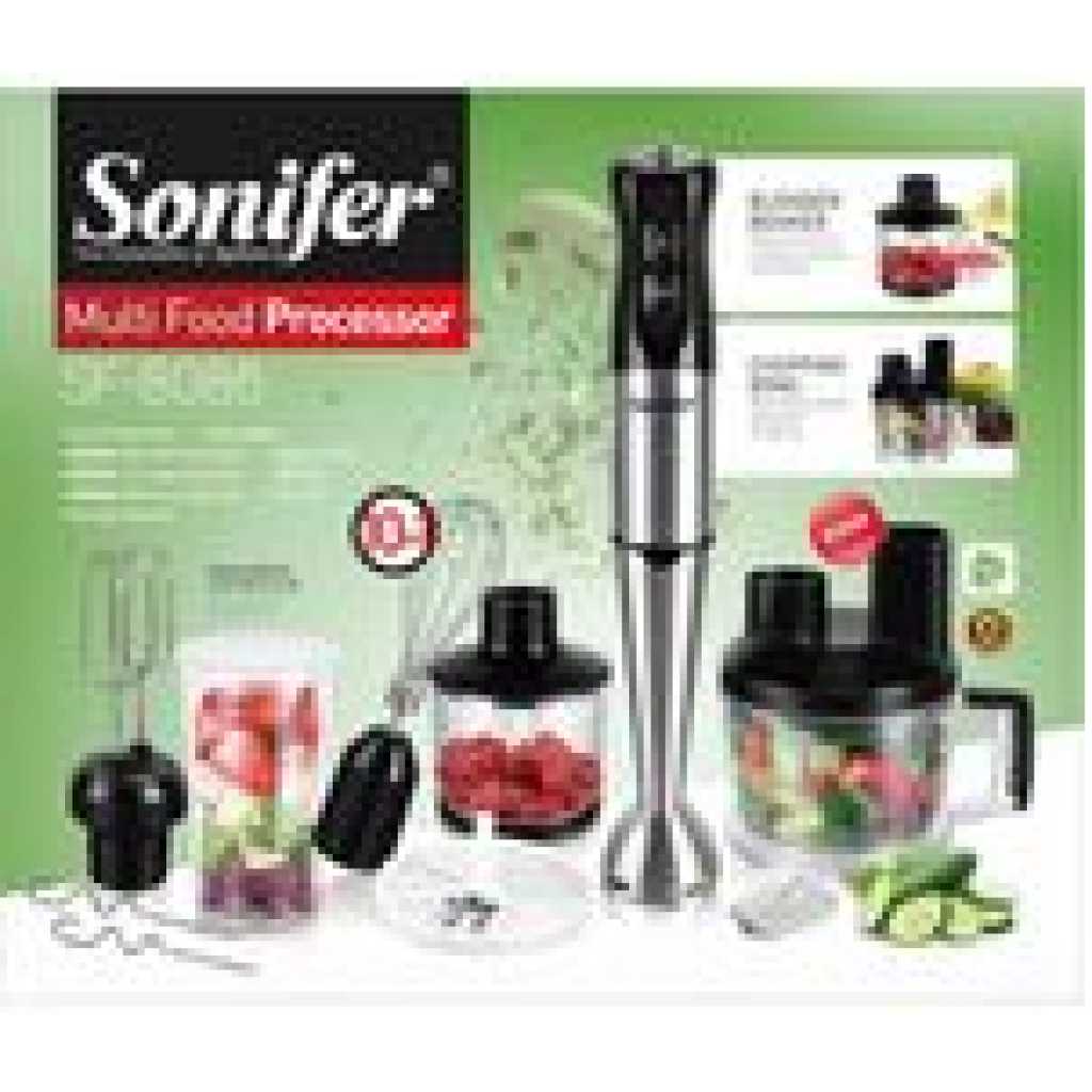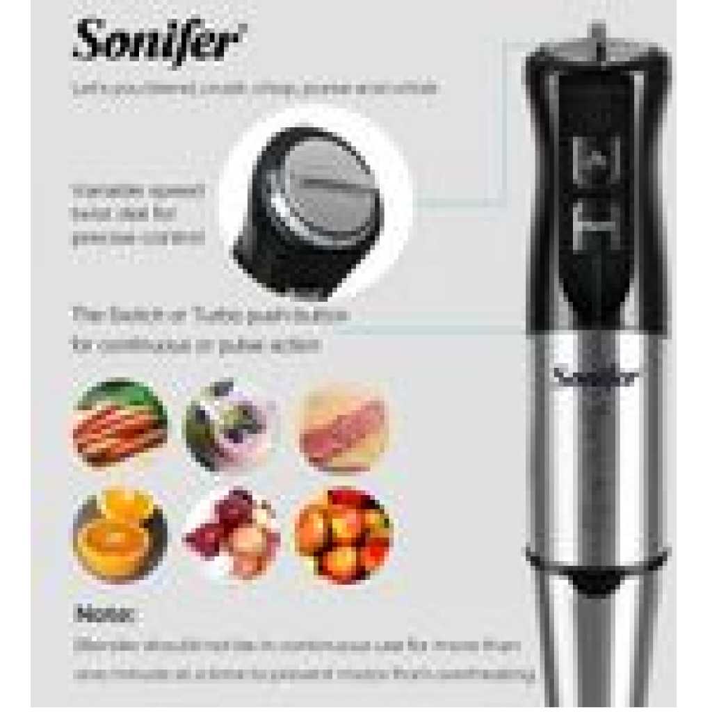 Sonifer multifunctional hand mixer is accompanied by a food processor, which practically transforms it into a food processor. This processor contains a push piston in its splash guard cover that directs food to a cutting disc with two interchangeable blades: Chopper and cold cutting machine. So you can grate, slice, chop, crush and mix countless foods