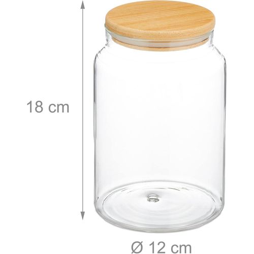 With the practical glass jars in a set of 3, you can store your food space-saving and clear. Whether pasta, rice, biscuits, cereal, cornflakes or coffee beans – the food jars are versatile. The cereal containers are made of glass and a bamboo lid with silicone ring that seals the storage containers airtight and keeps the contents fresh for longer. Thanks to the transparent design, the filled kitchen storage containers are also a real eye-catcher. Storage jars with lid in detail. Dimensions H x D: approx. 18 x 12 cm. Volume: approx. 1500 ml. Weight: each approx. 400 g. Material: borosilicate glass, bamboo, silicone. Colour: transparent, natural. Storage jars for the kitchen. In a practical set of 3 for various foods. For pasta, lentils, cereal, sweets and much more. Airtight thanks to bamboo lid with silicone ring. Clear storage: elegant design with naturally grained lid. Clean jars in the dishwasher and lid by hand. Box contents: 3 x storage jars. Decorative items are not included