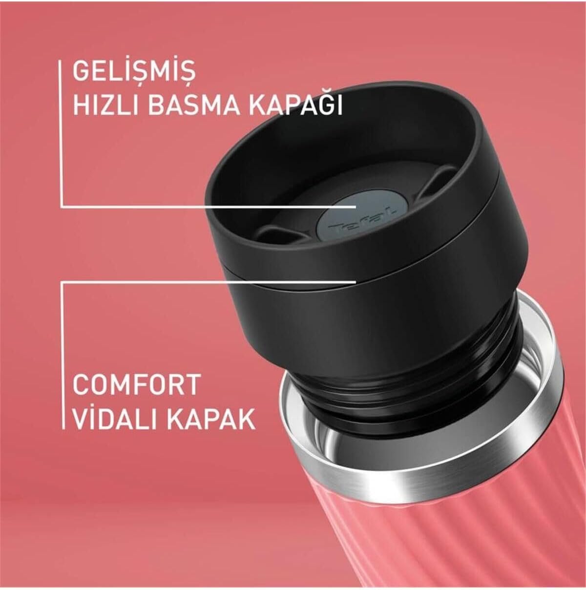 TEFAL Thermal Bottle Travel Mug Twist-Coral, Comfort Screw Lid, Quick Press Drinkware, Soft-Touch Sleeve, Travel-Ready, Reusable, 100% Leak-Proof, Keeps Drinks Cold (8 hrs) and Hot (4 hrs), 360° Drinking, N2024410