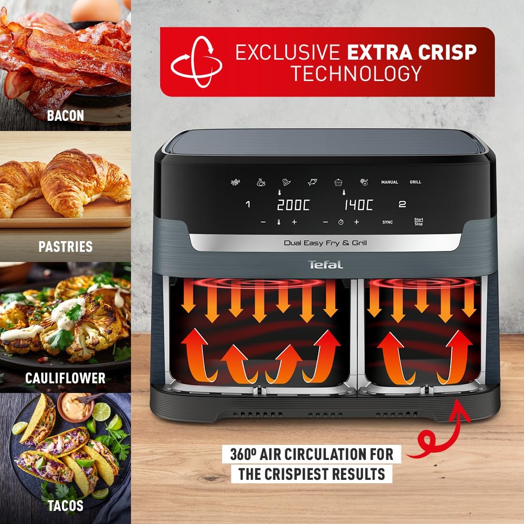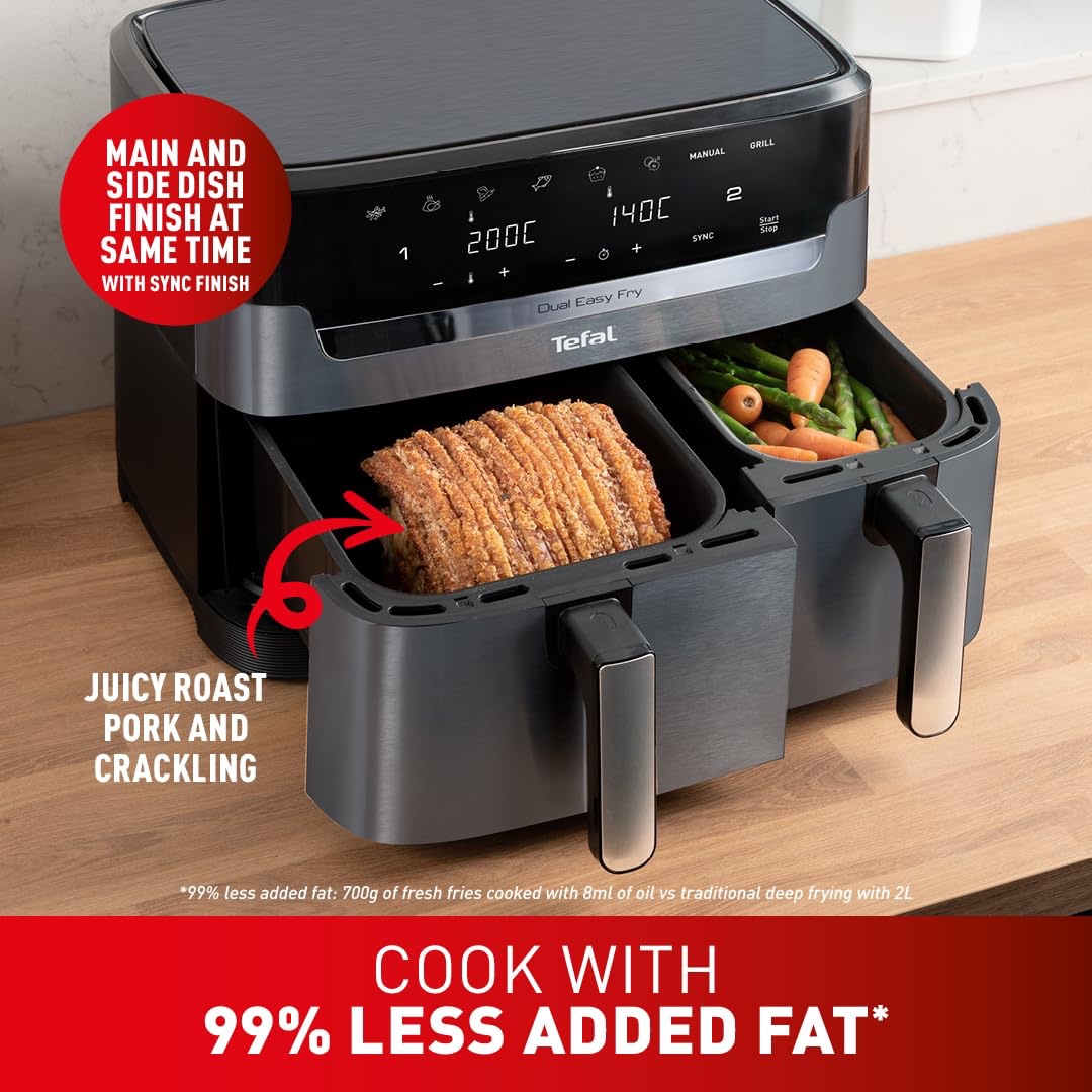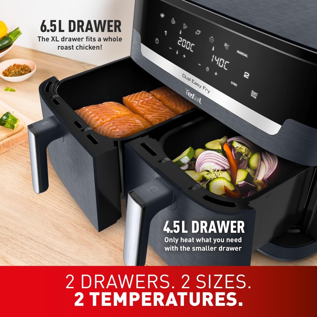 Tefal XXL Dual Easy Fry 11L Air Fryer, Dual Drawer, No Oil, Extra Crisp, Roast, Bake, Reheat, Dehydrate, 7 Pre-set Programs, Dishwasher Safe, 8+ Portions, Java-Grey, EY9428G0