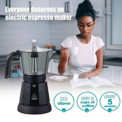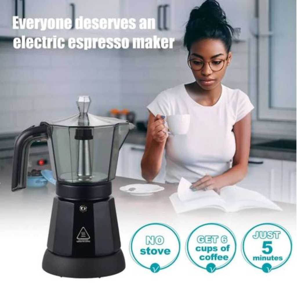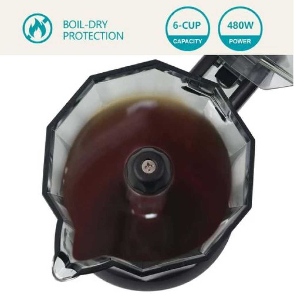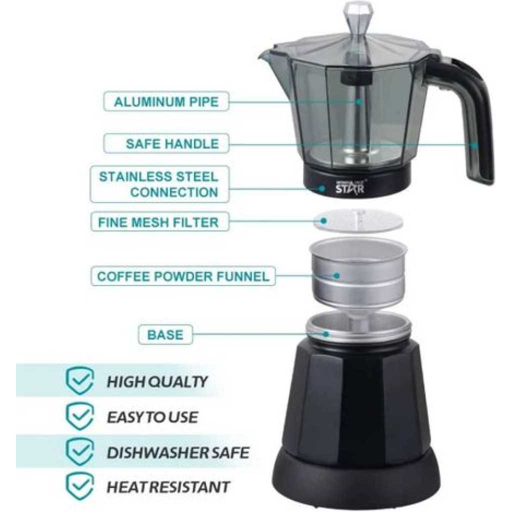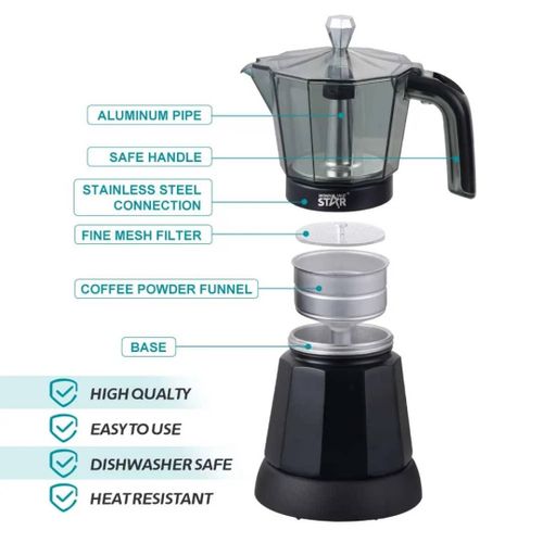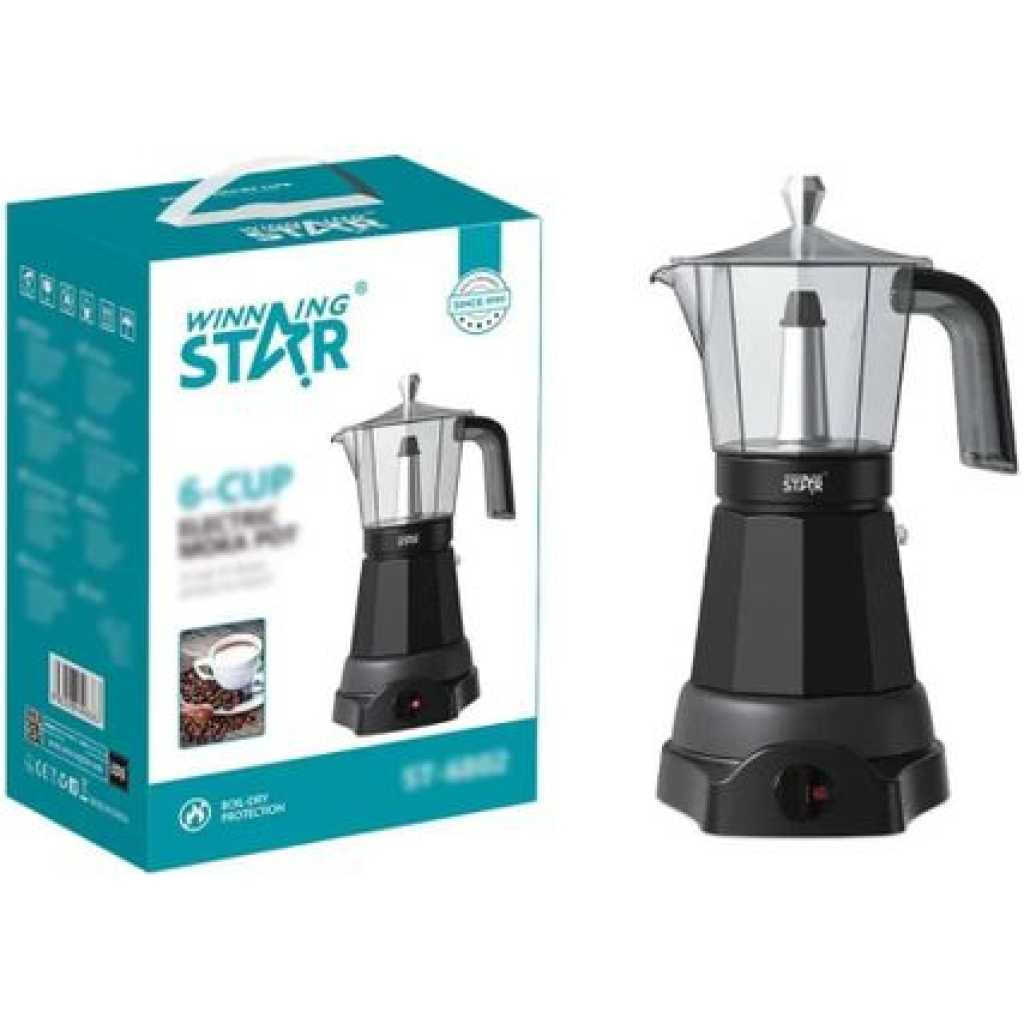 This WINNING STAR ST-6802 Electric Moka Pot is made from high-quality Nylon, die-cast aluminum, and PC material, ensuring durability and safety. It features a 480W power output with AC 220V-240V voltage support, automatic rebound power-off, anti-dry burning function, and a working power indicator for added convenience